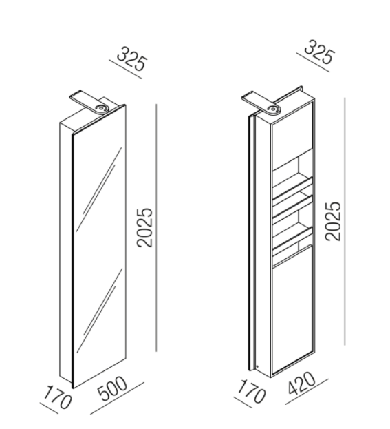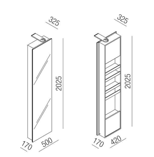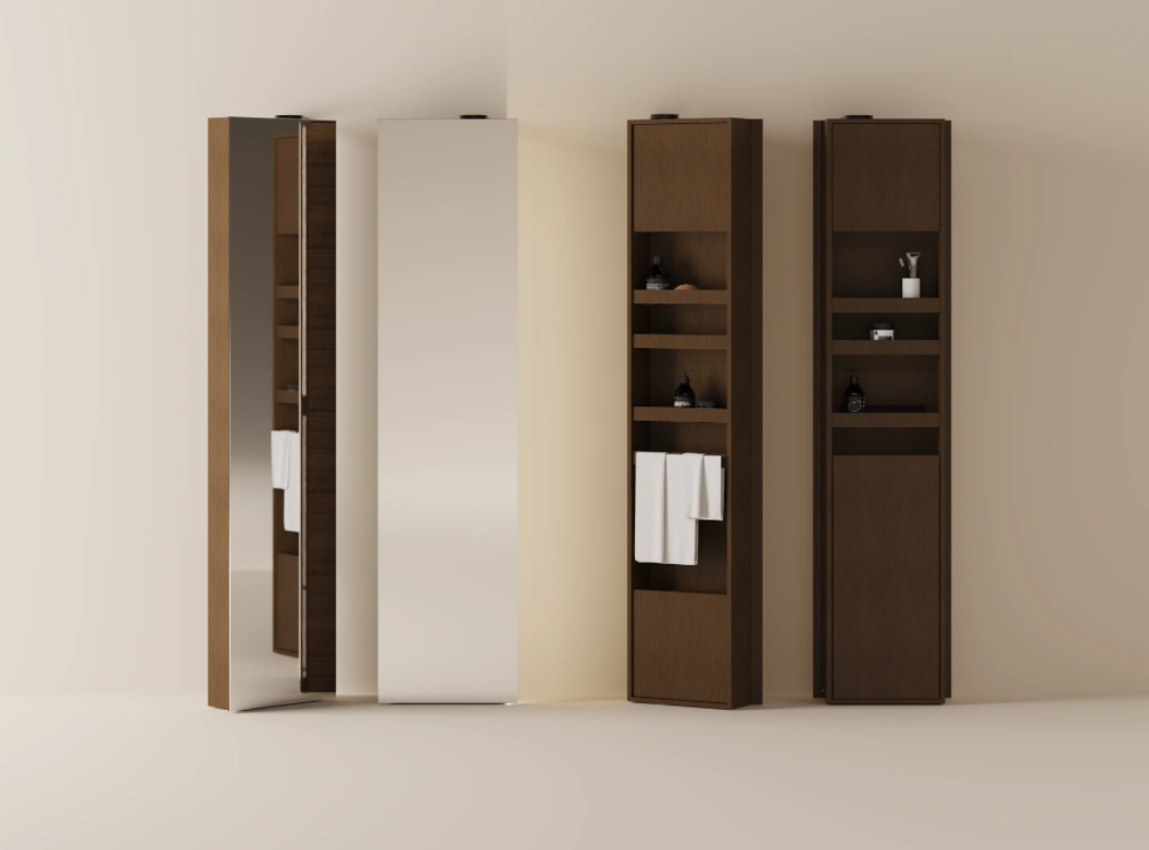 How to keep an empty space around the tub and sink, making good use of their sculptural presence while also keeping everything you need to use them close at hand? Voila? is a new retractable container with a mirror that pivots at two points along the vertical axis. When needed, the mirrored surface rotates and reveals the interior equipped with shelves, towel racks and power outlets. Voila? itself becomes an architectural element in the room, creating movement and perspective with a rhythmic series of columns for a functional, furnished wall.
