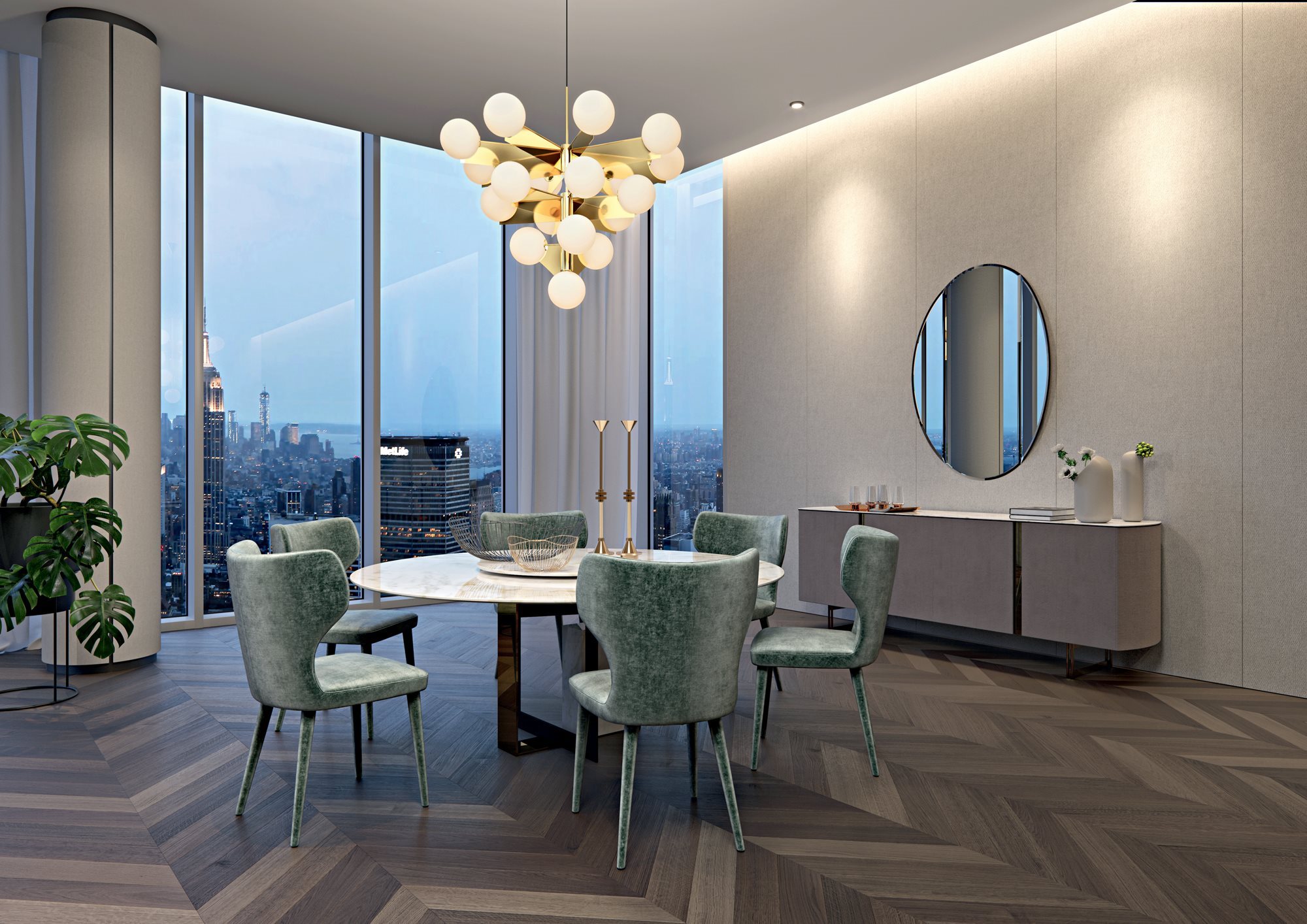 The Moore table is characterized by the research for a pure geometry through unusual volumes, lines, and cuts. The base is designed with careful balance, given by the interlocking between two metal plates: a glossy golden one that houses the monolithic block in ceramic with marble effect, and a matte black embossed one. Available in round or rectangular version, the top is made of ceramic with marble finish, to obtain thin yet resistant thickness.