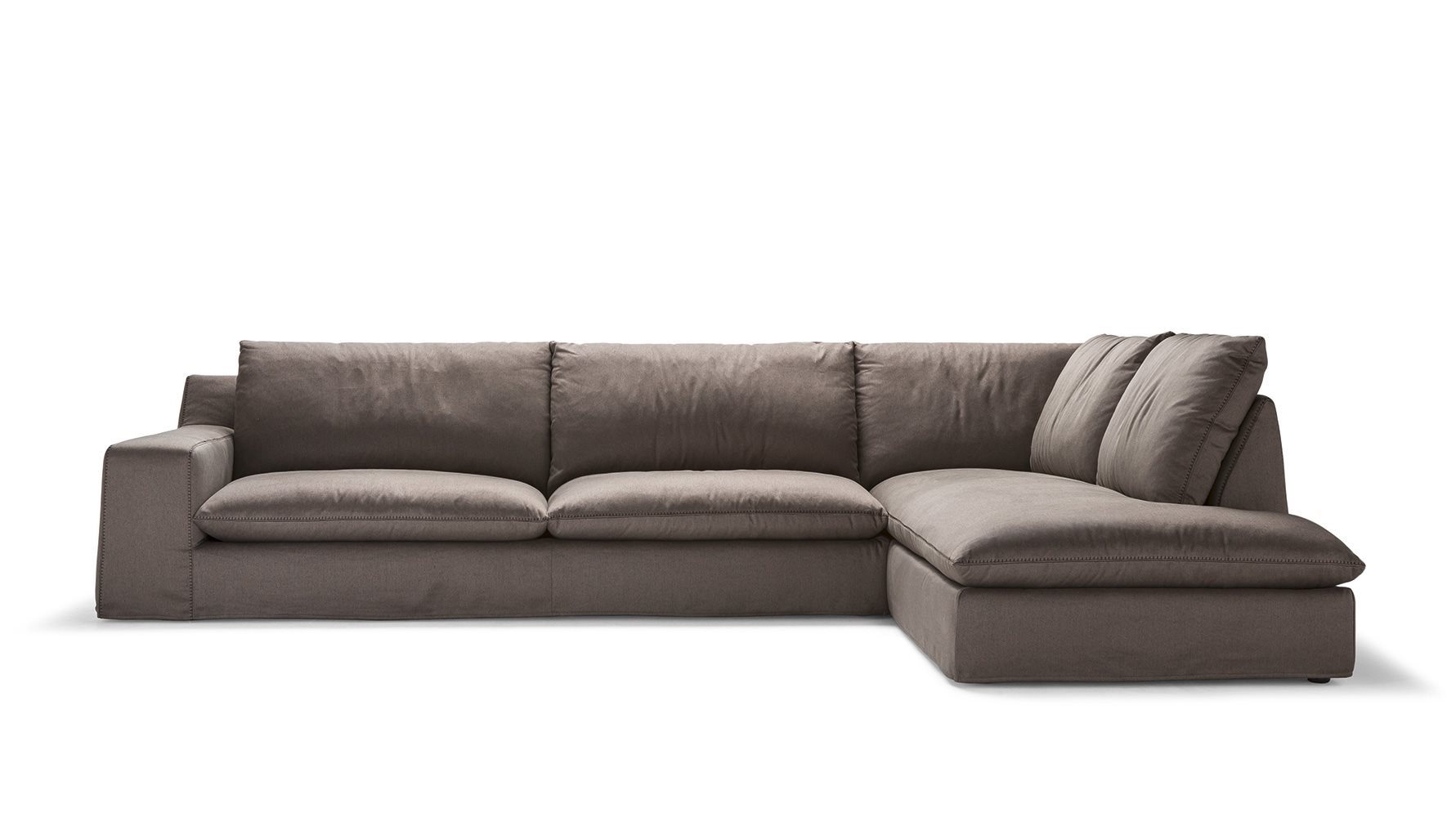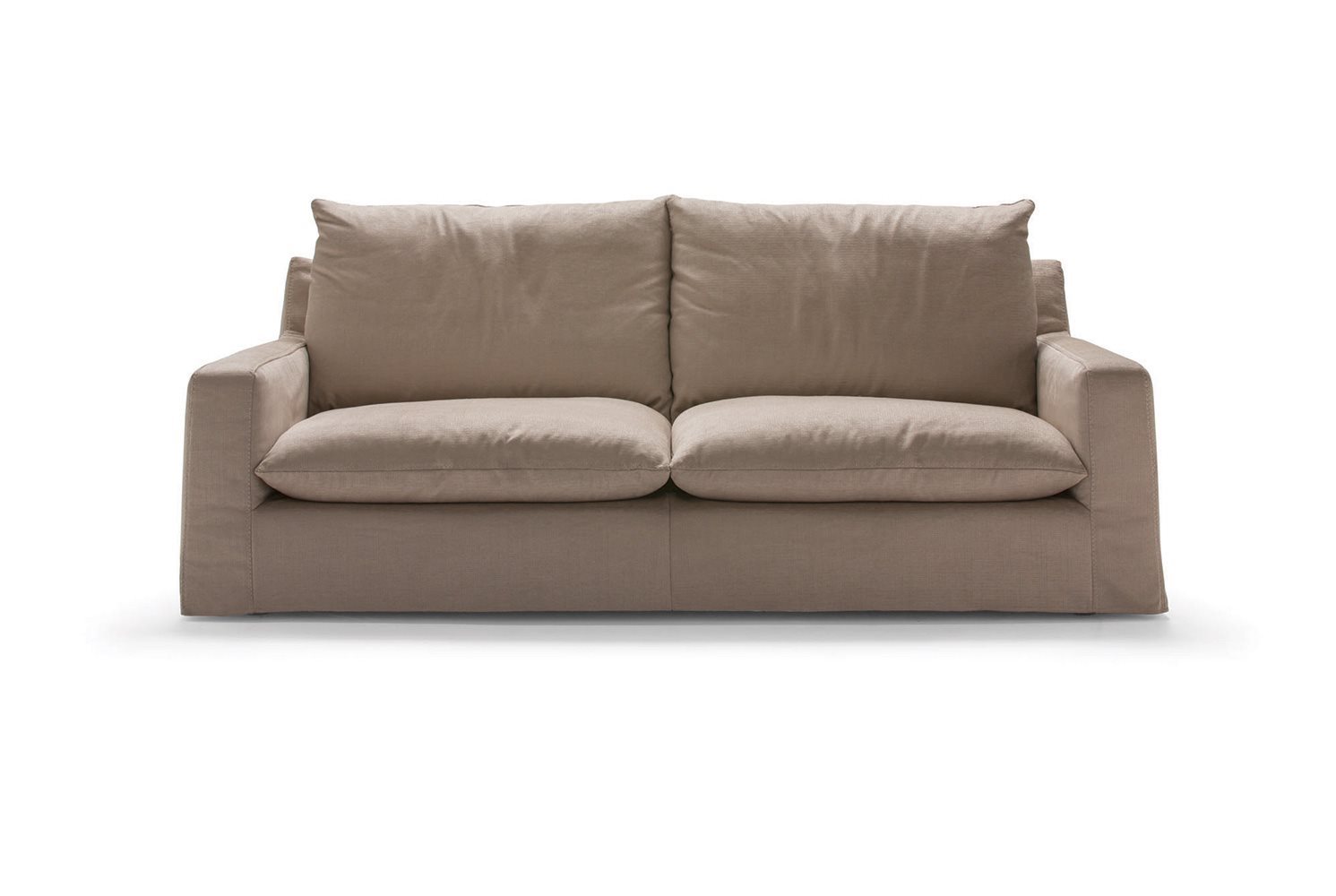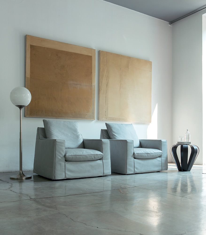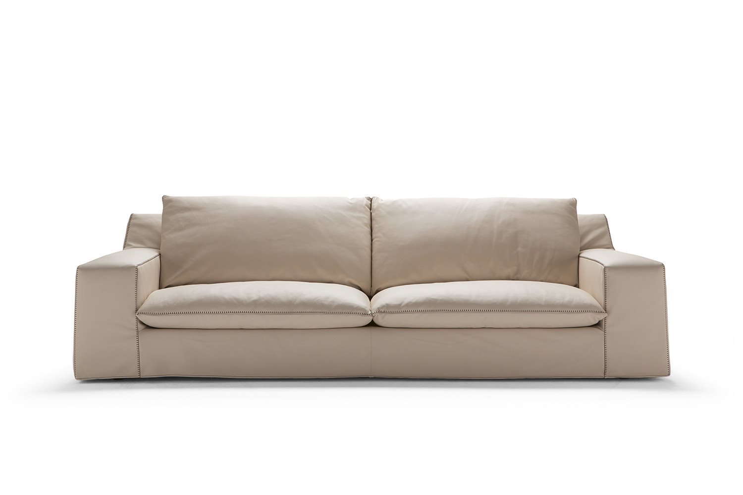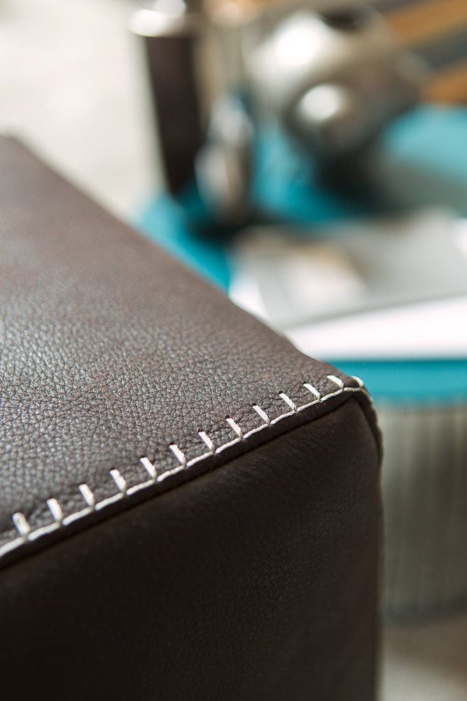 Leather and fabric covers. The finishing and the attention to the details make it a product with a strong personality. Theo combines a safeness image (thanks to its lines and comfort) with an unconventional taste. Its softness contrasts with the graphic line of the stitching which defines the shapes and makes it unique and precious. The stitching can be contrasting or “ton sur ton”. The high comfort is given by seat and back cushions in polyurethane foam, goose feathers and polyesther fyber and also by the elastic belts. The range of the model includes items with two armrests, sectional elements - sofas, armchairs, dormeuse, meridienne - and an attractive armchair with narrower armrests than the sofa. The sofas can be equipped with electrically-welded spring and high density polyurethane foam mattress. It’s available also with a thin armrest. The Model in leather is available also without flowing cut with standard armor thin arm.