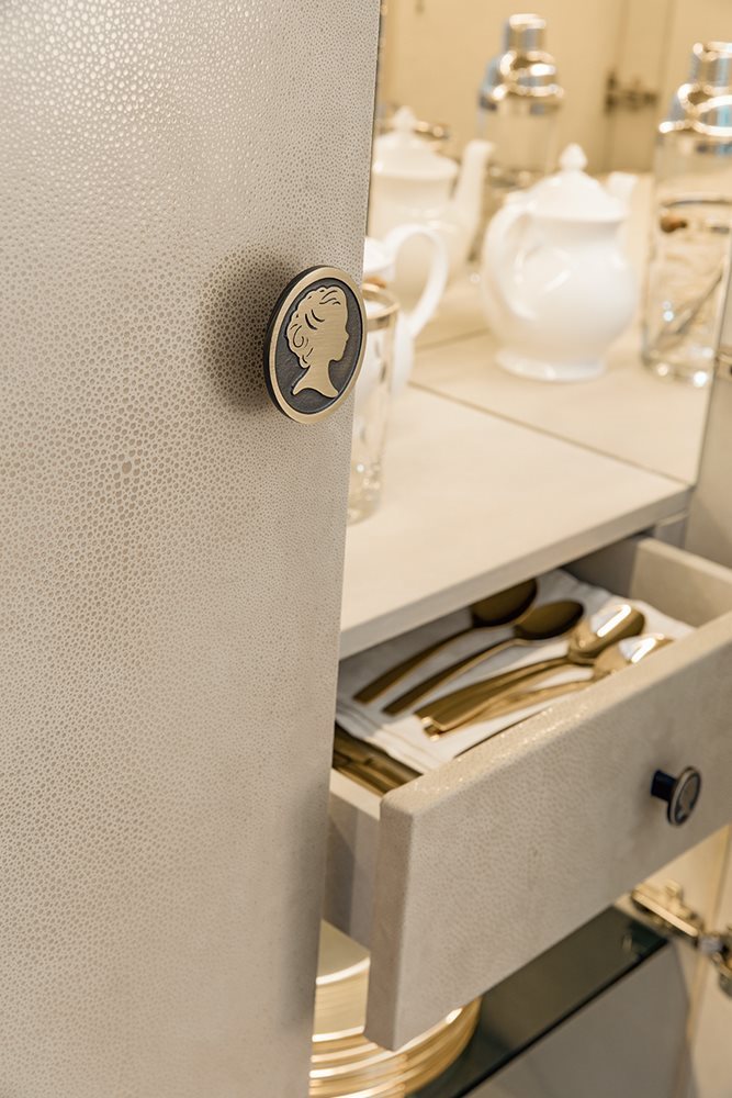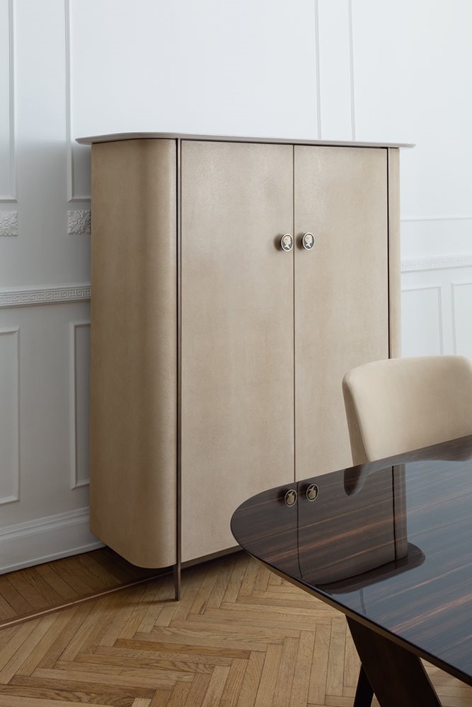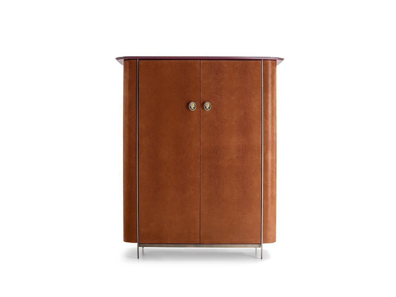 The high tailoring details distinguish the series of Alexander units. Drawer units and cupboards made with high fashion details, matching the best leather to the noble finishes and bright metal.Structure, doors and drawers are covered with leather, to give the entire range the elegant style typical of haut couture Italian leather work.