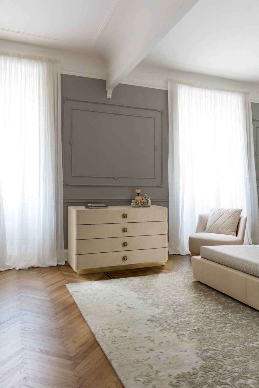 Jasmine is a family of refined storage units perfectly interpreting the new trends of contemporary living.   The drawers are covered in printed leather with weave effect that lends the elegance and style typical of superior Italian leatherwear to the entire collection.
