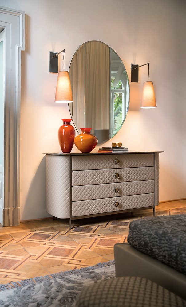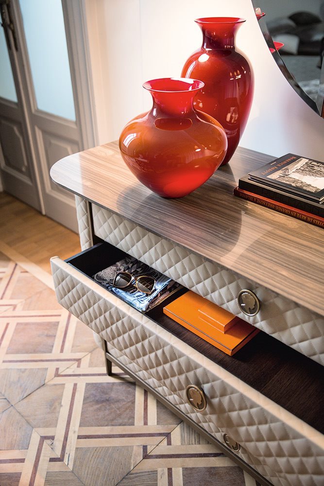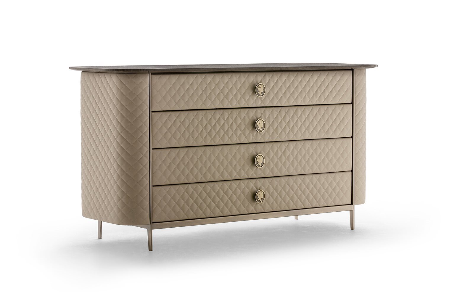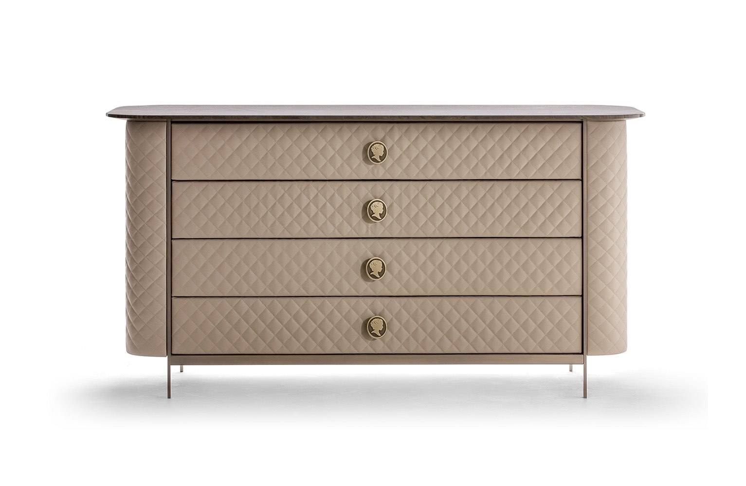 The high tailoring details distinguish the series of Penelope units. Drawer units and cupboards made with high fashion details, matching the best leather to the noble finishes and bright metal. Structure, doors and drawers are covered with diamond quilted leather, to give the entire range the elegant style typical of haut couture Italian leather work.