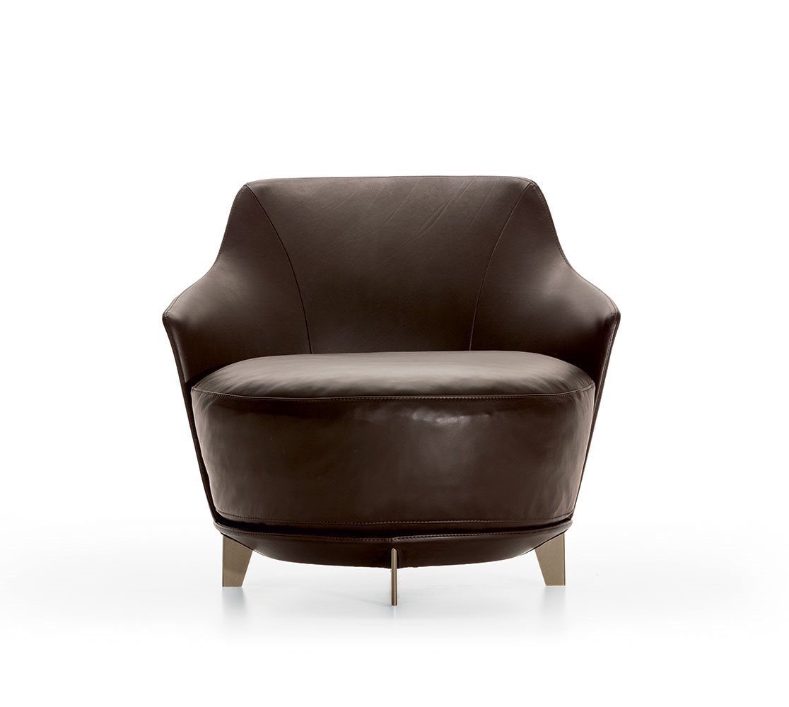 Poltrona. Struttura portante: multistrato, massello di legno. Imbottiture: Schienale in poliuretano espanso (densità 21 Kg/mc). Seduta in piuma d’oca con inserto in poliuretano espanso (densità 40 Kg/mc). Piedino: in metallo (finiture French Bronze o Gun Metal).