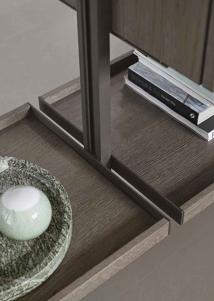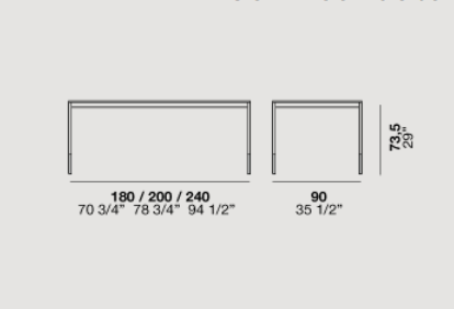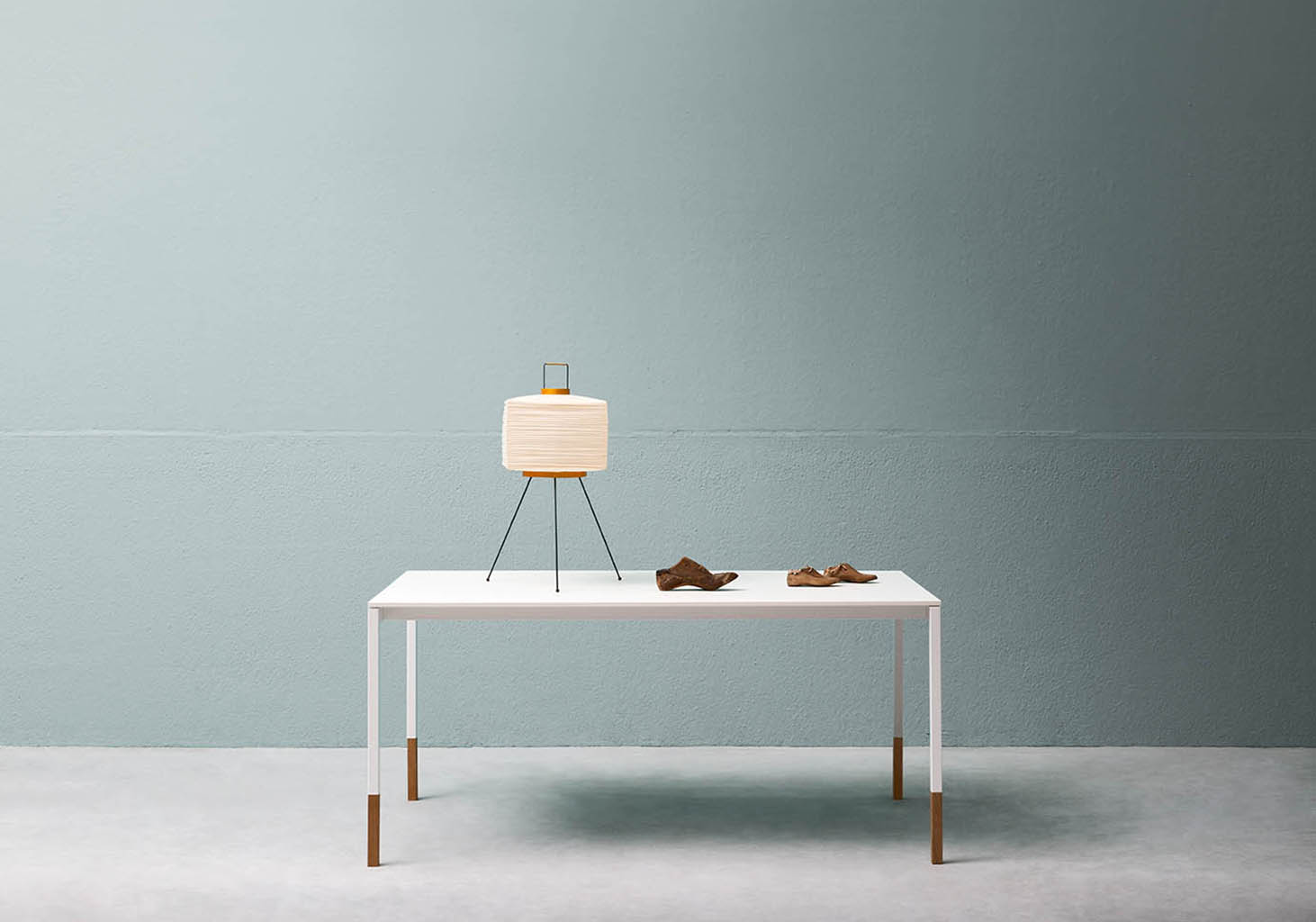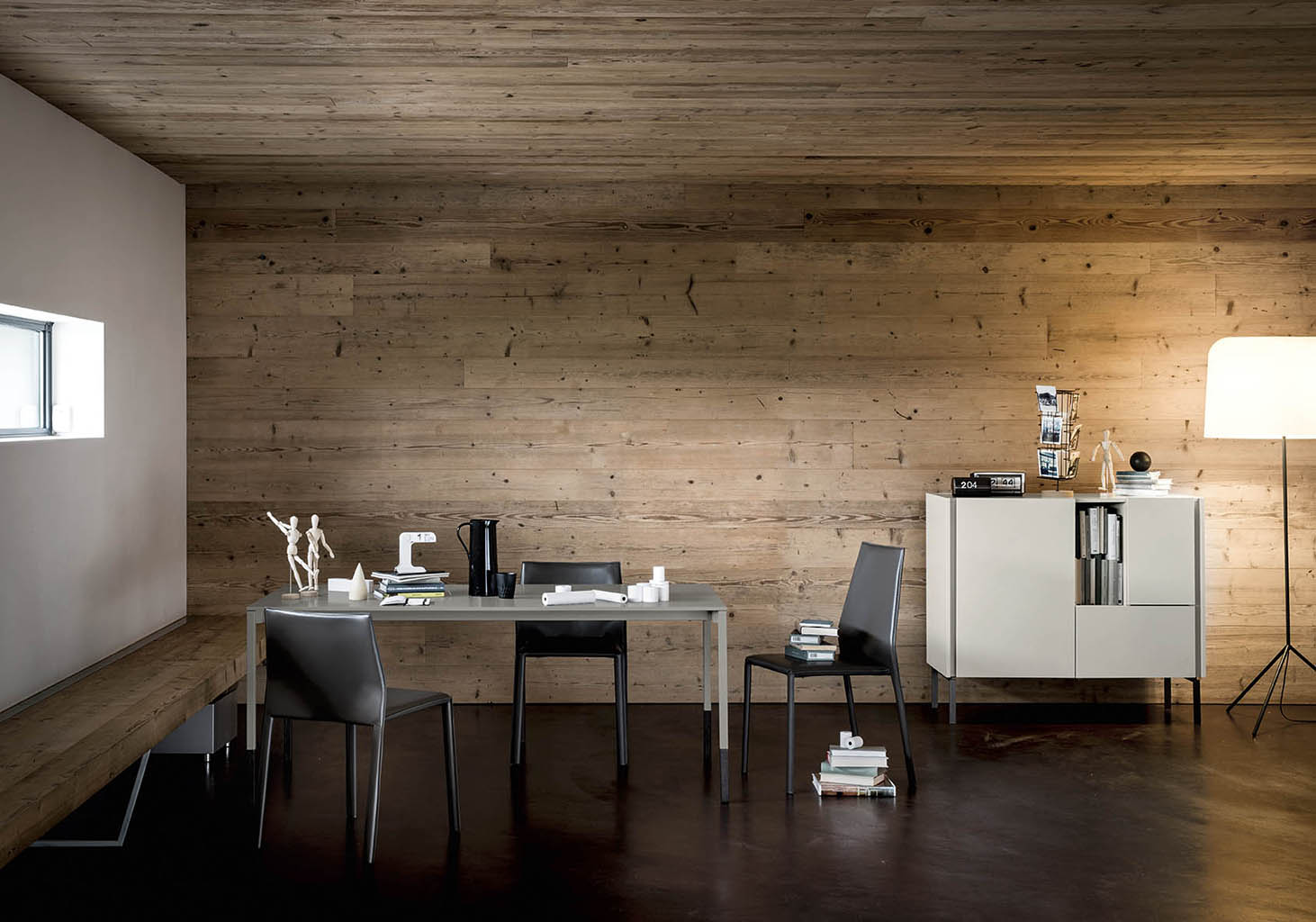 The Aliante table has a metal frame and can be square or rectangular. It comes in a fixed or extendable version. This table’s defining feature is its wooden “socks", which are available in various finishes to go with the lacquered upper part of the table, according to personal taste.