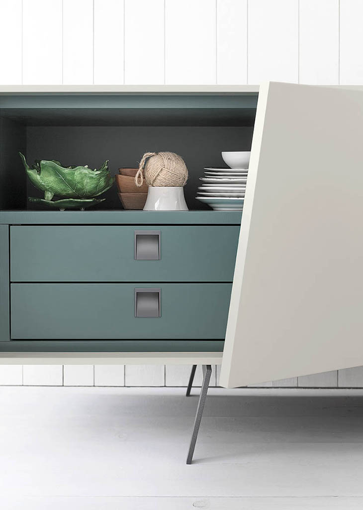 Musa is available as a sideboard, cabinet or display cabinet, and its main feature is the rounded shape of its carcass. It also stands out for the sloping cut of the doors that conceal the handle and continue in the lines of the painted metal feet. The interior can be lacquered and fitted – in the sideboard version – with a practical drawer unit.