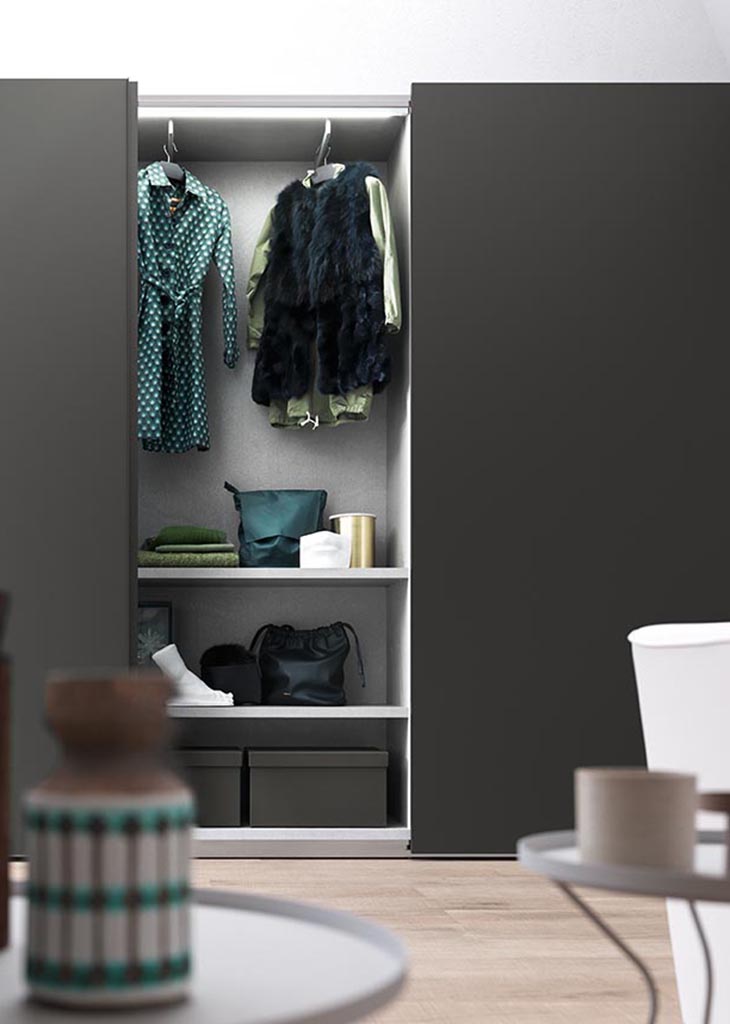 Available in swinging and sliding versions, it can also be combined with modules with drawers with the groove profile running horizontally.