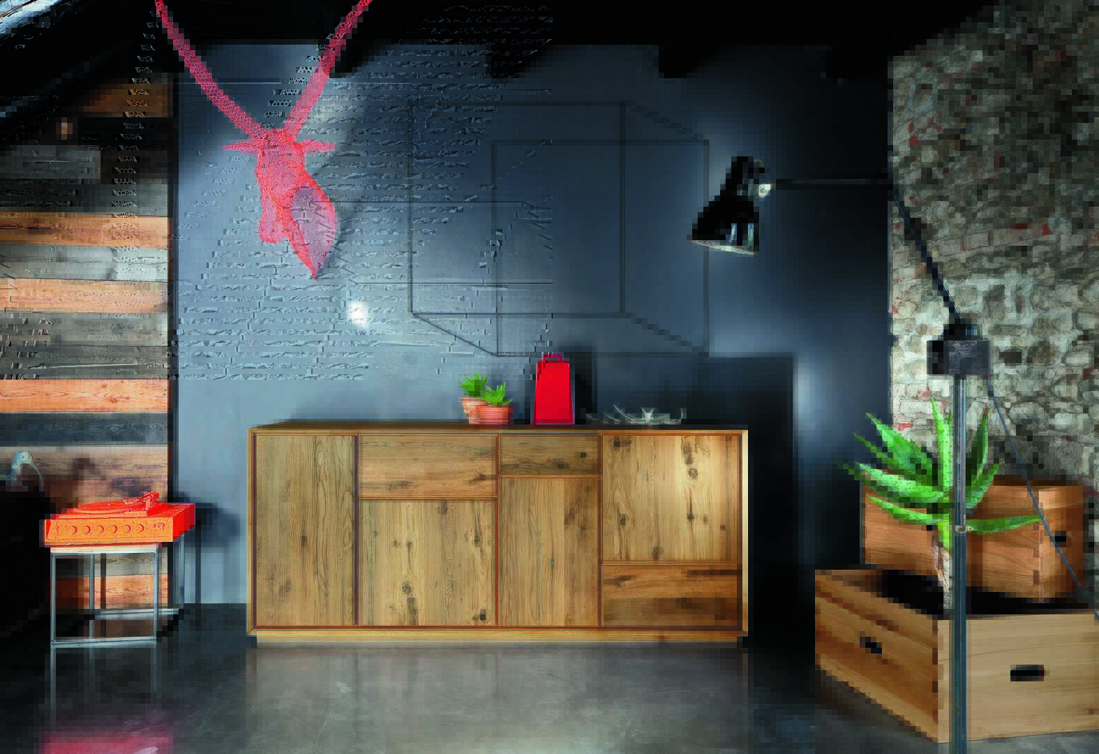 In this section of the sideboard with 655mm high, we can see the walnut sideboard, with Industry finish open compartment and the Rovere Vecchio sideboard with Azzurro Vintage open compartment.