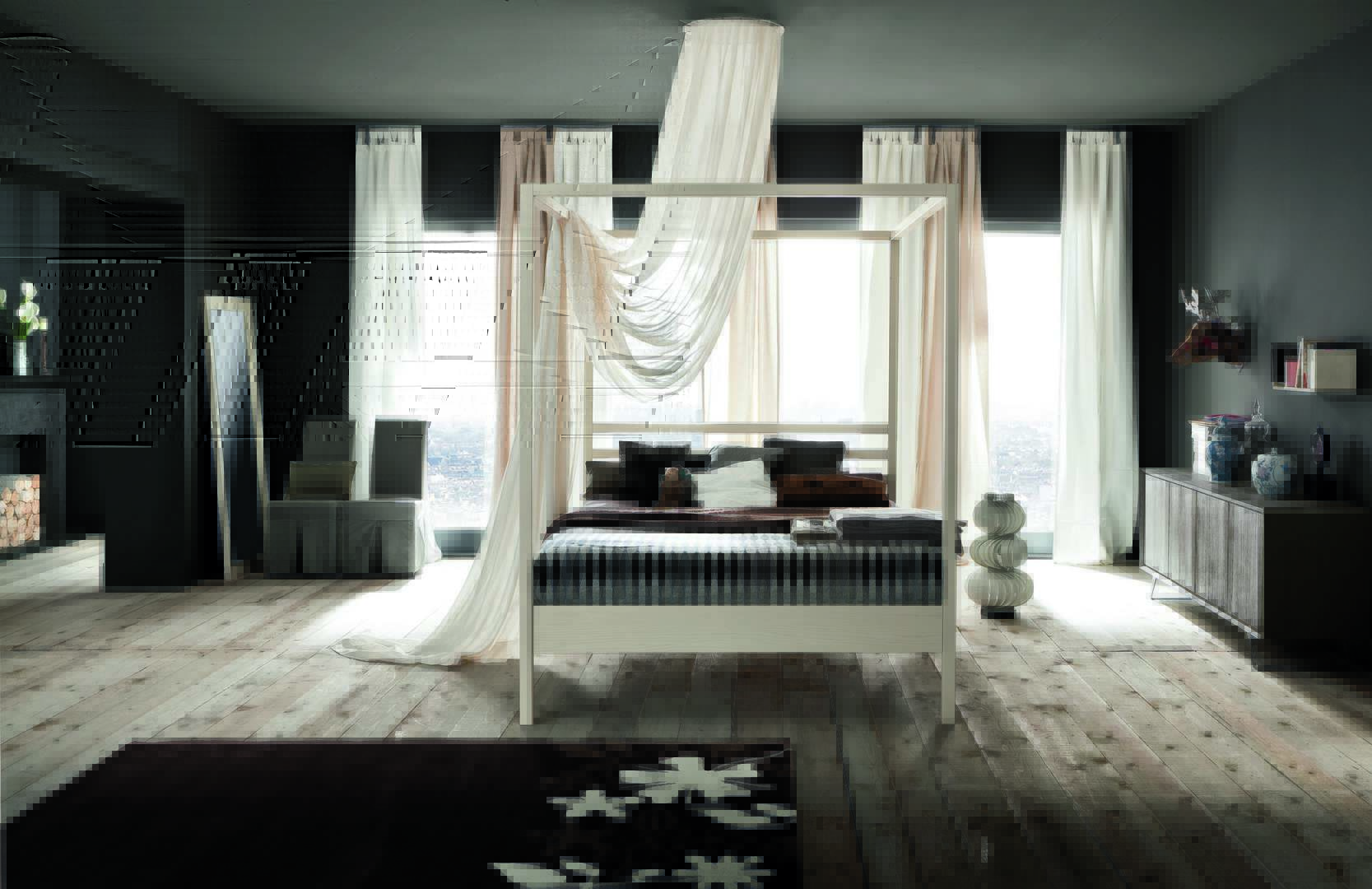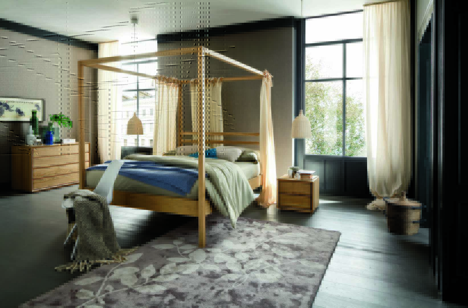 Nemo Bed in solid oak Canapa Sabbiato finish, with four-poster structure.