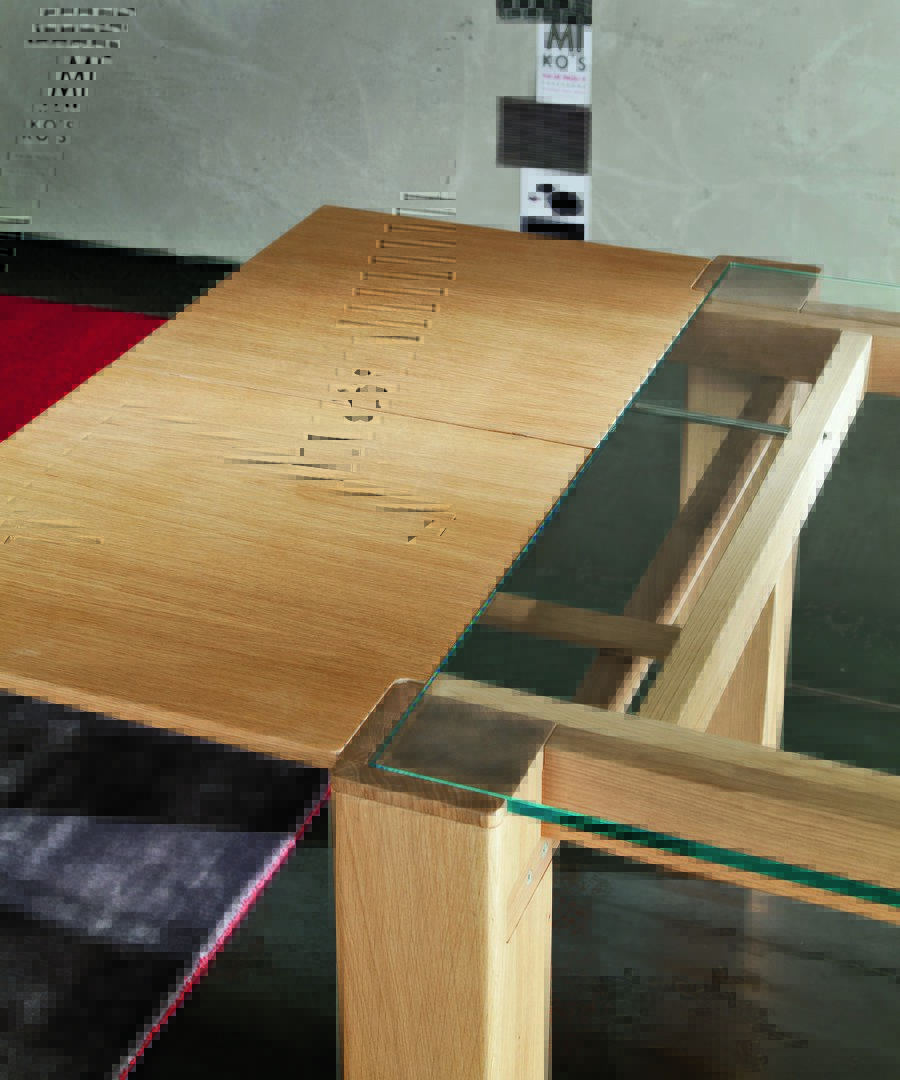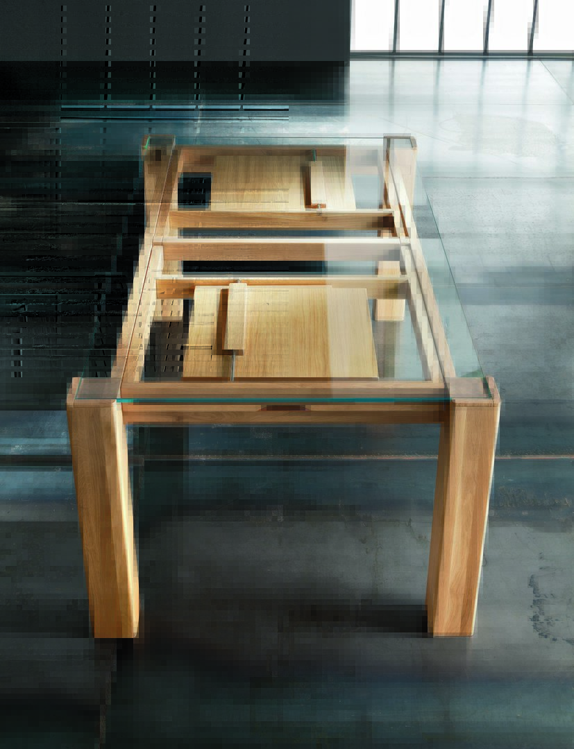 Sidney table with structure and legs in solid oak, multilayer extensions covered with 10/10 extra-thick oak veneer and extra-light tempered glass.top.