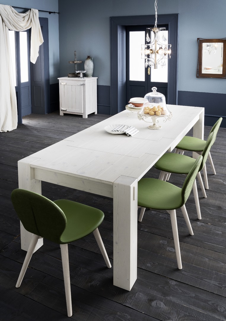 Stoccolma table in brushed sruce structure. Here presented in Bianco finish, with Nina chairs.
