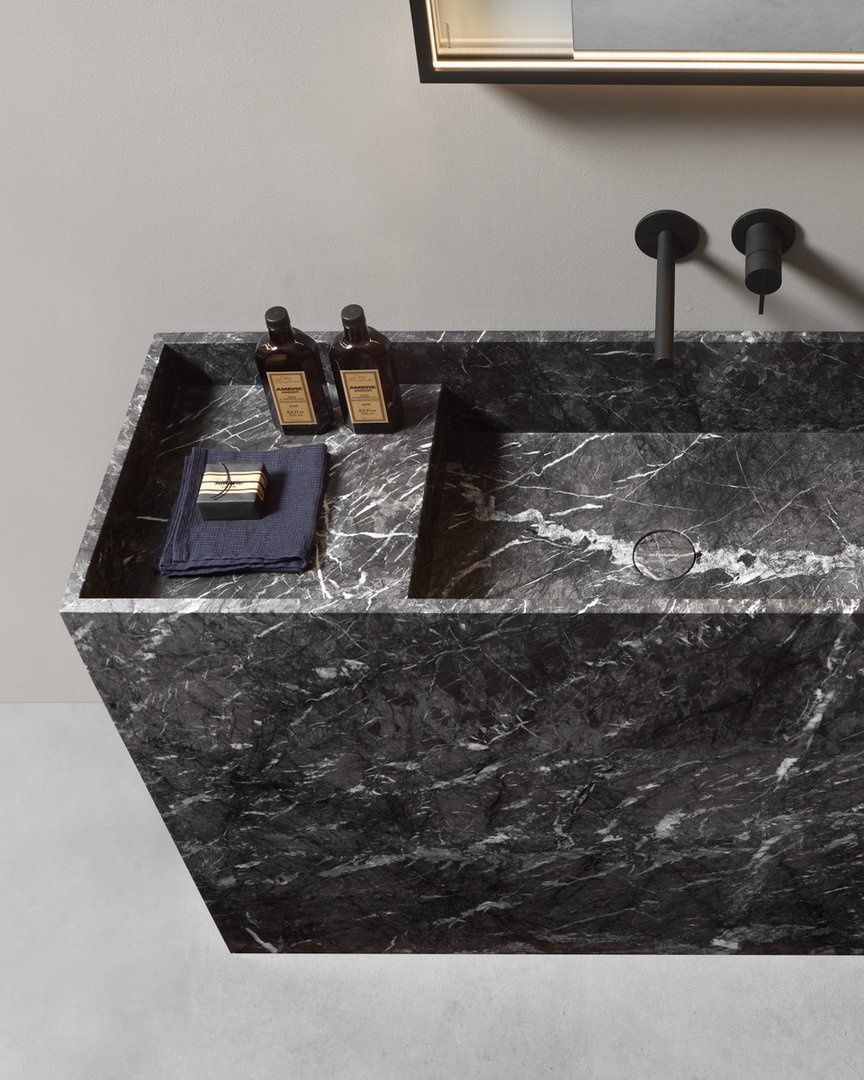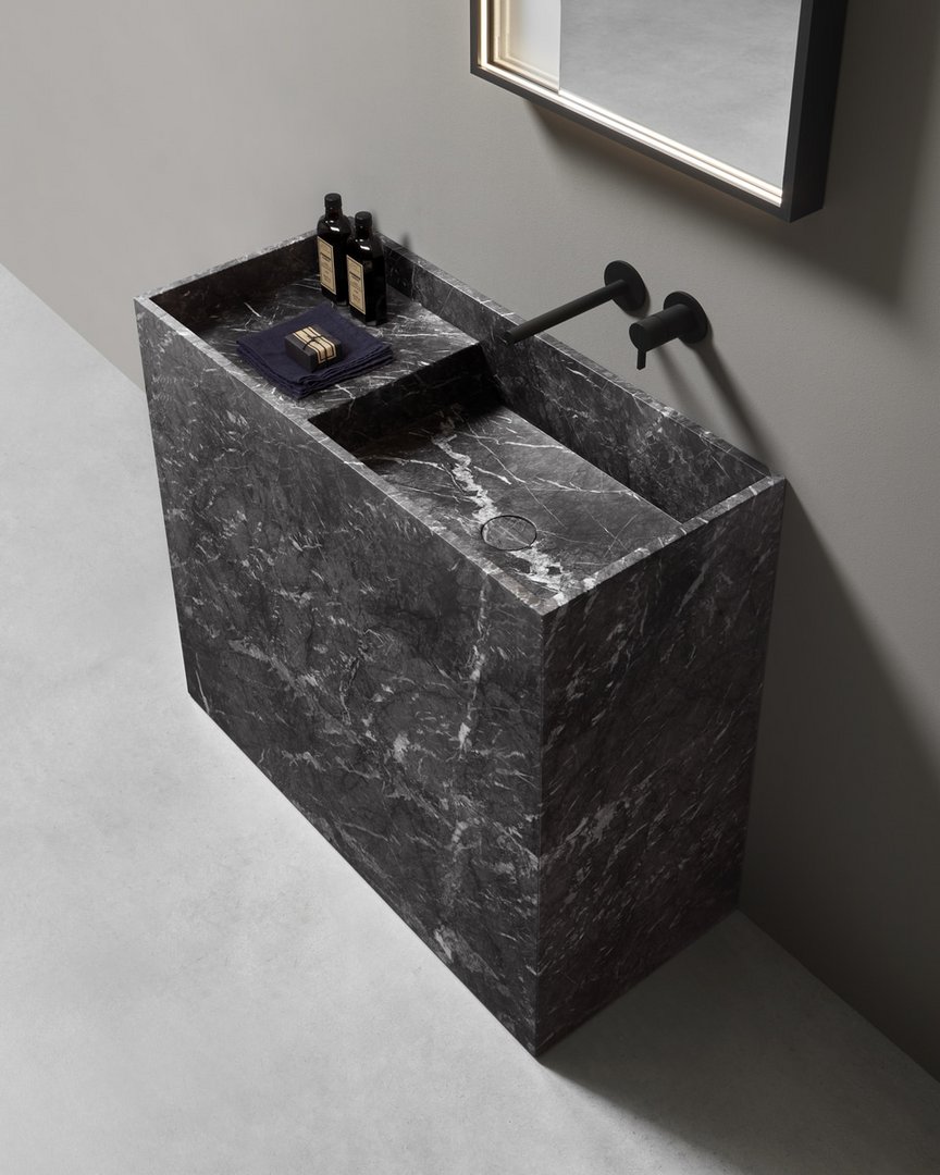 Le forme sono squadrate, le linee ortogonali disegnano geometrie pure e definiscono volumi con funzionalità diverse, lo spazio viene utilizzato al meglio grazie a proporzioni equilibrate e spessori sottili. La pietra è la grande protagonista di questi monoliti, la forma di MyStreet_Floor nasce dalla conoscenza del materiale e dal lavoro dell’uomo per dargli una forma contemporanea. Diverse le larghezze disponibili per il lavabo da terra che assume così conformazioni più compatte o slanciate. Un lavabo che sembra scavato nella roccia e porta con sé le tracce uniche di una storia, le sfumature, le leggere variazioni cromatiche, una serie aperta che permette di soddisfare le esigenze di ciascuno e di rendere unica e personalizzata l’area lavaggio.