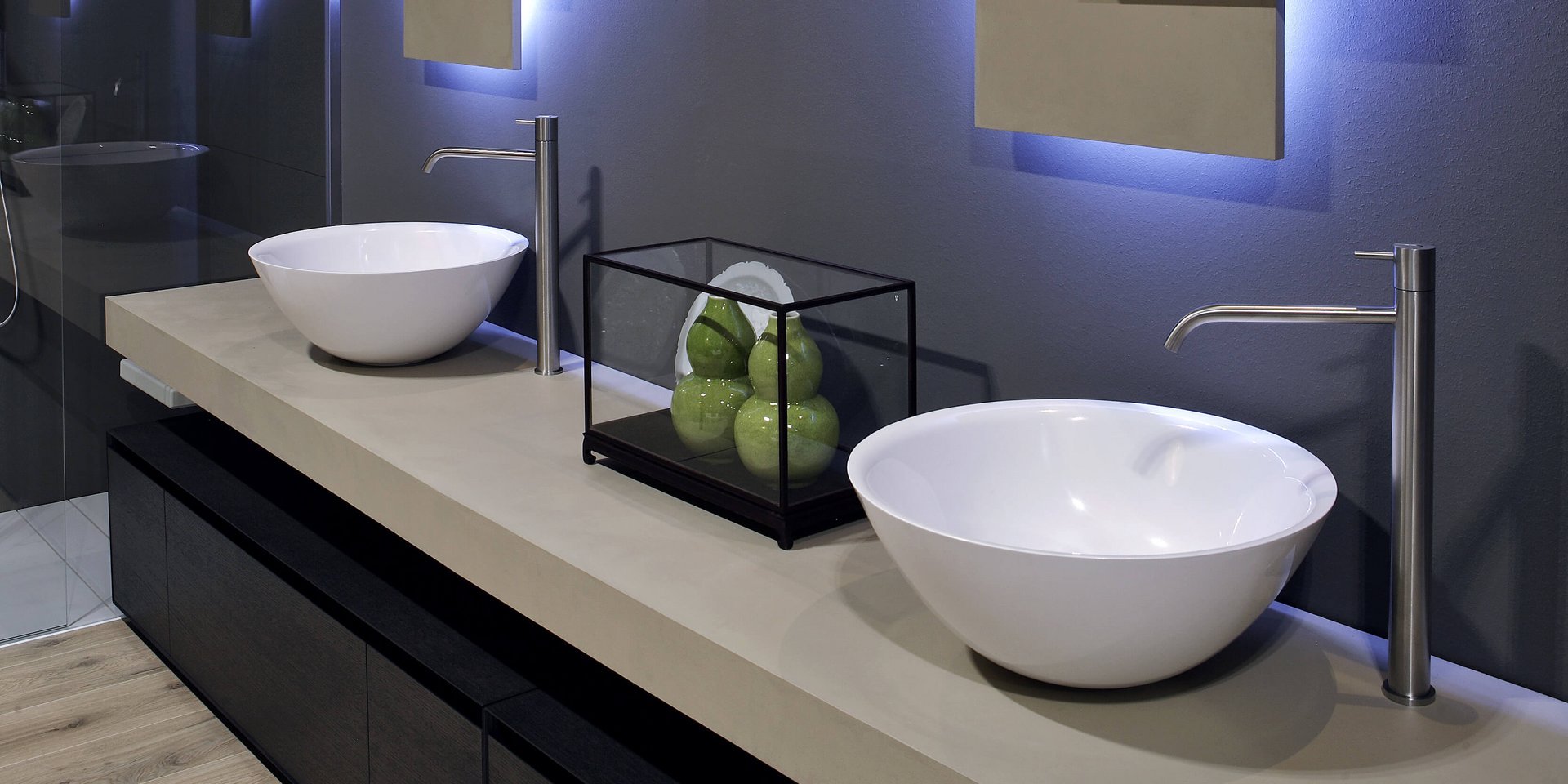 Round top mount Flumood? sink complete with drain pipe fitting and open plug, that can be lacquered externally.