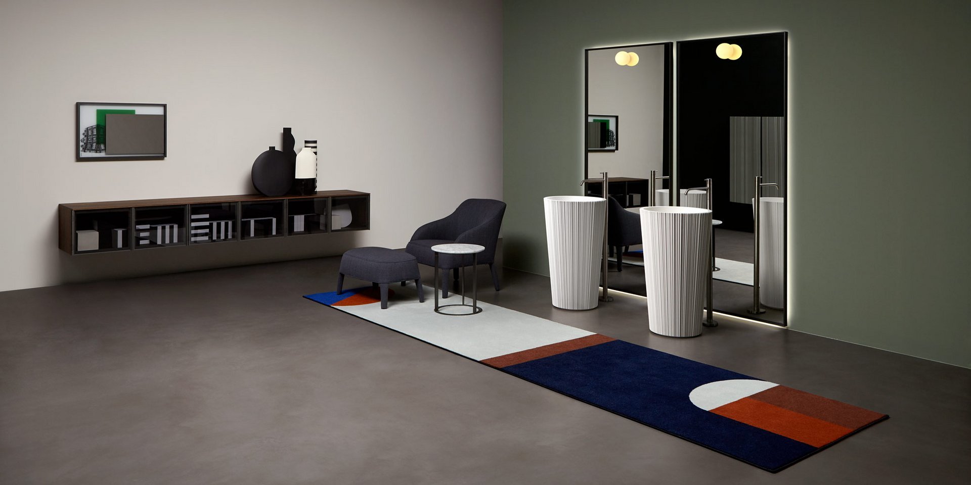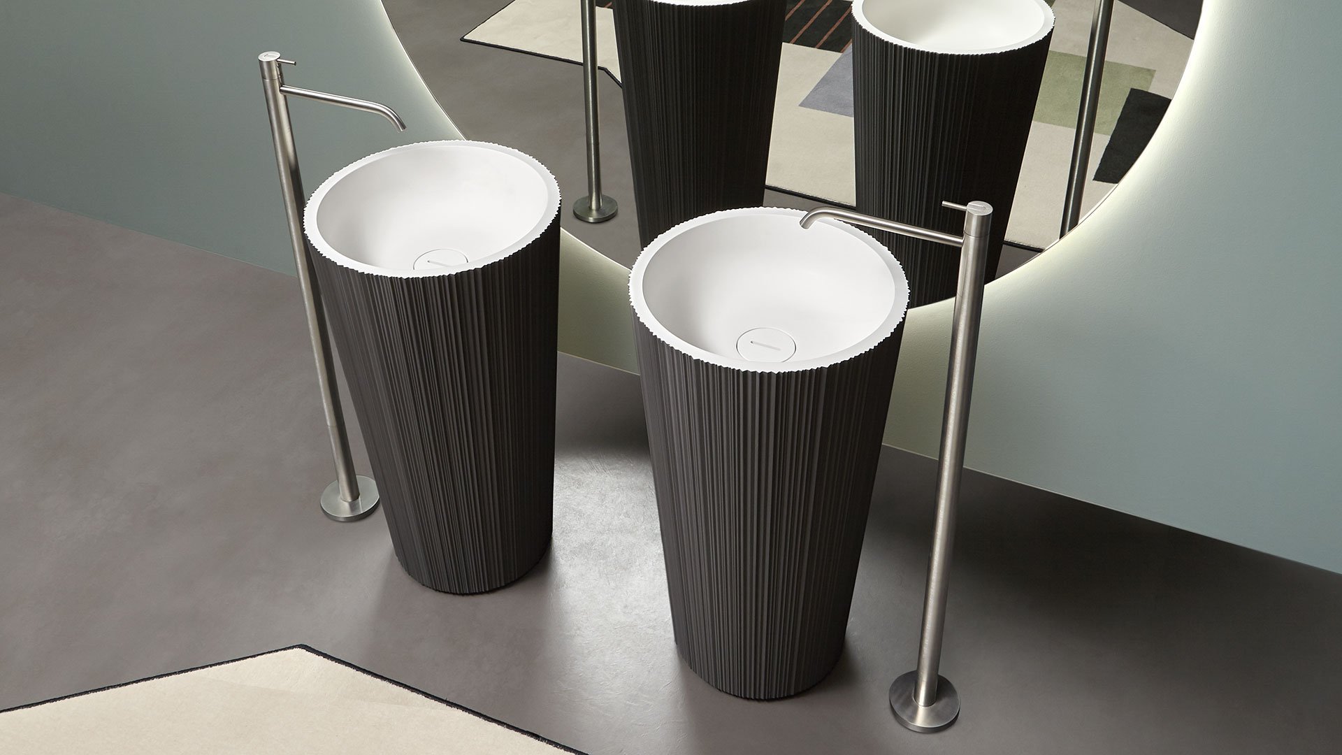 Freestanding flumood sink with floor drainage complete with open plug, siphon and flexible hose.
