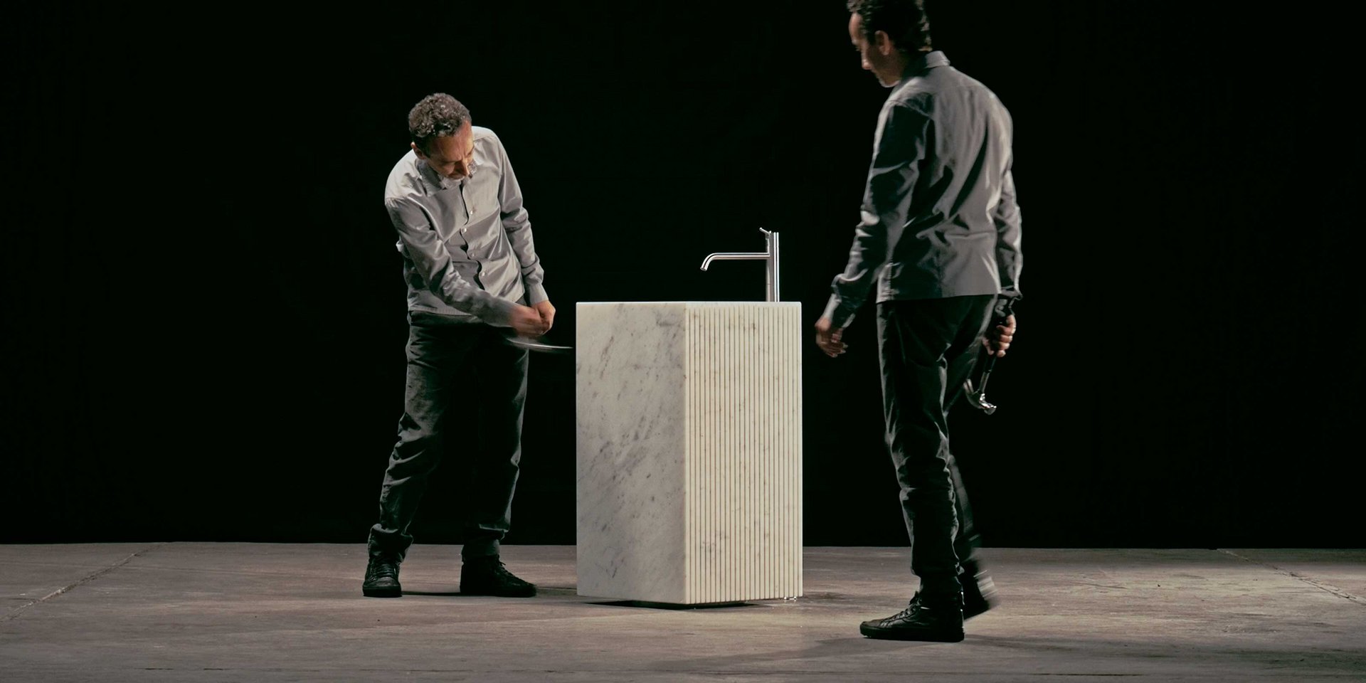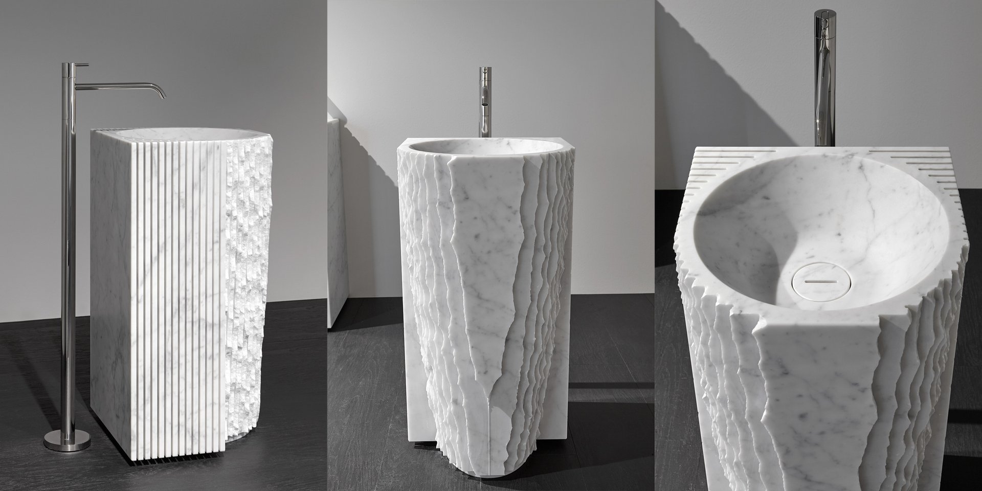 Freestanding stone sink, complete with drain pipe fitting and open plug, trap and flexible hose.