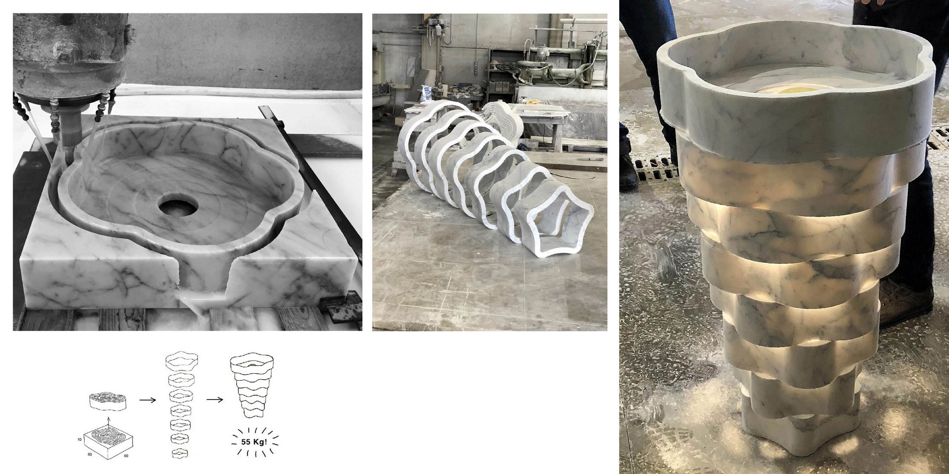 Freestanding stone sink with floor drainage complete with open plug, siphon and rigid hose.