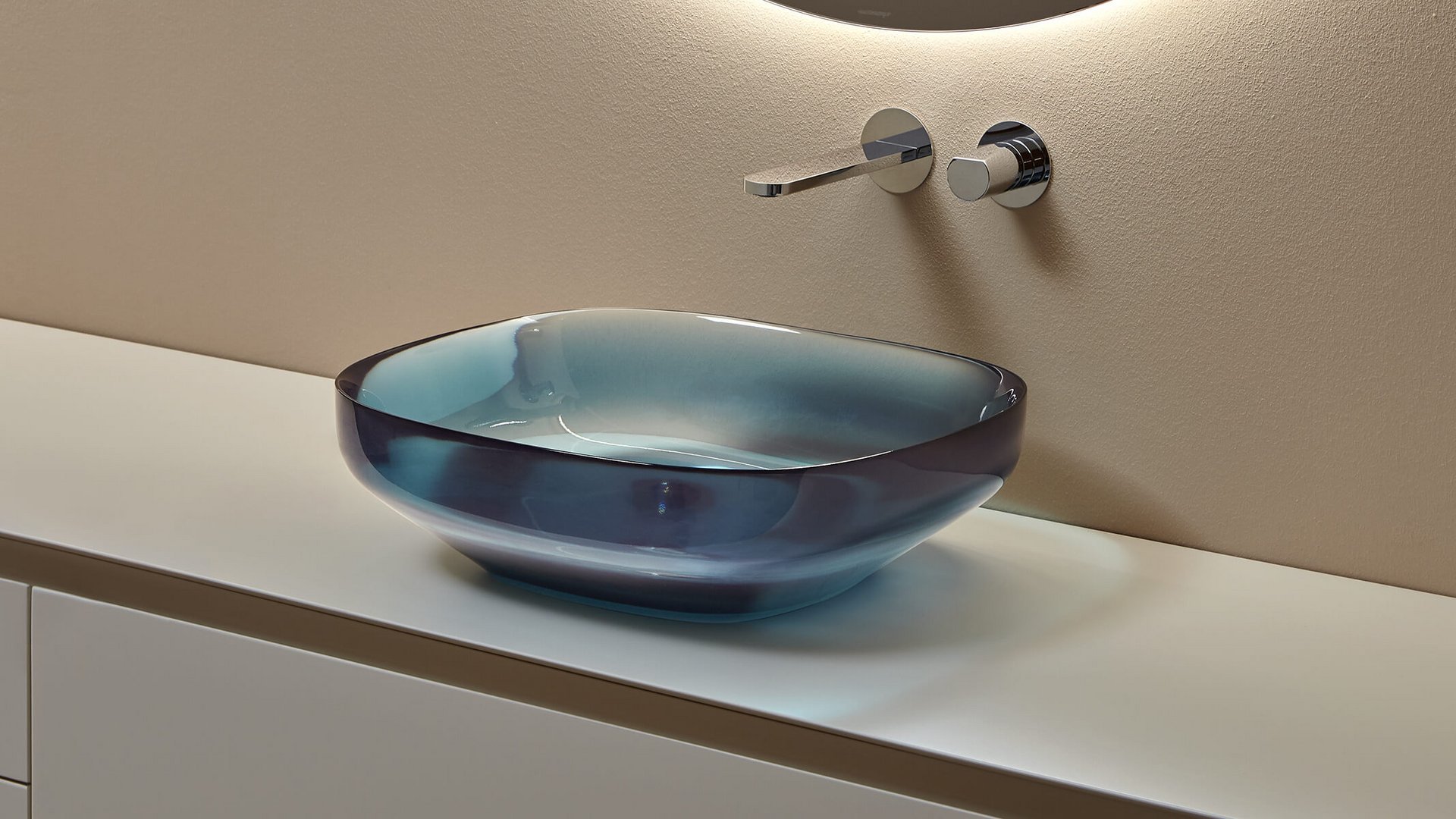 Oval top mount sink in Cristalmood, available in various colors complete with drain pipe fitting and open plug.