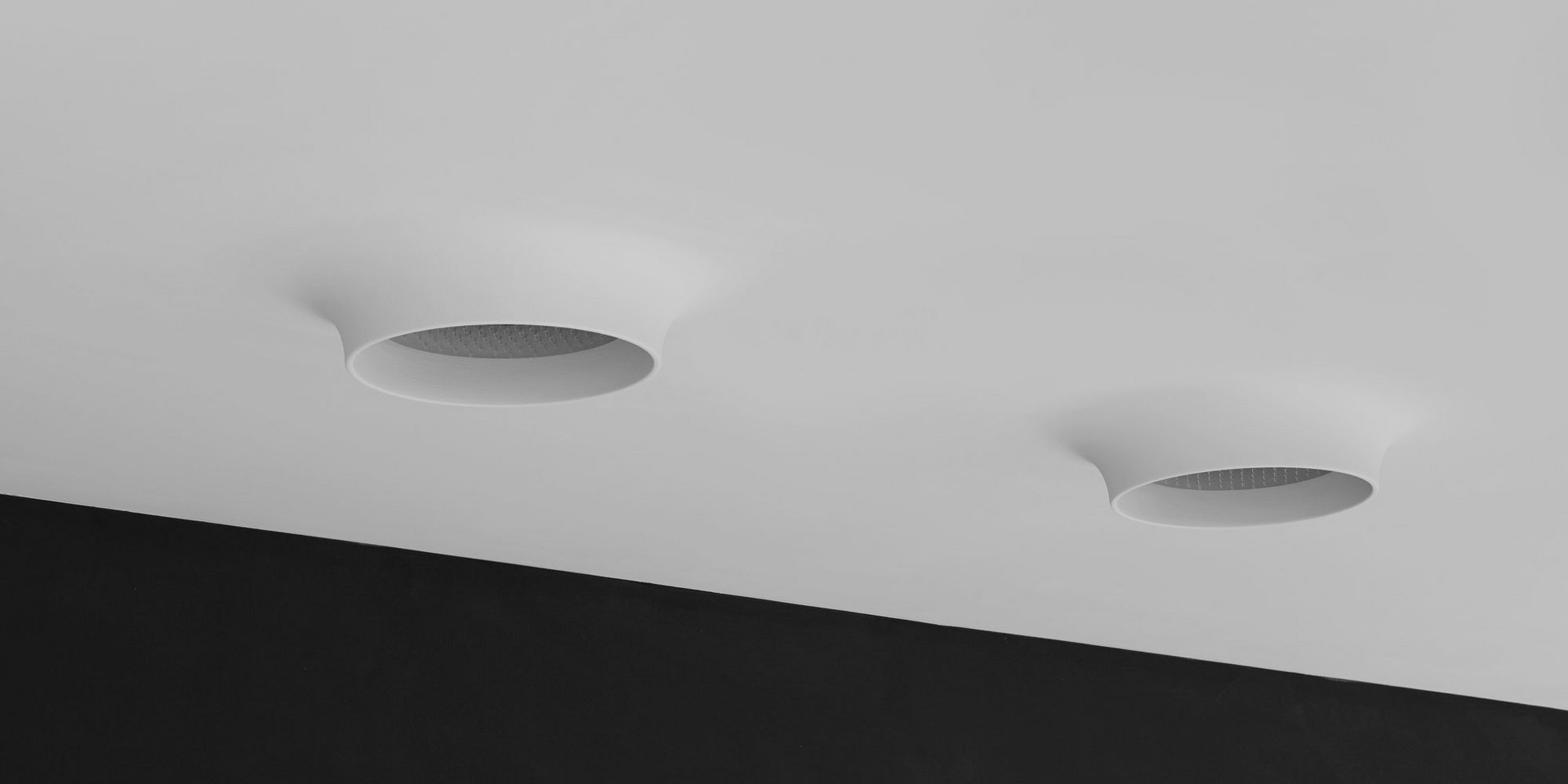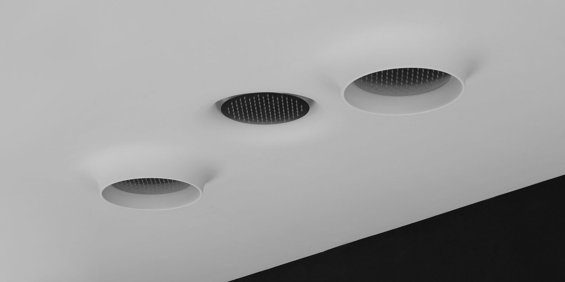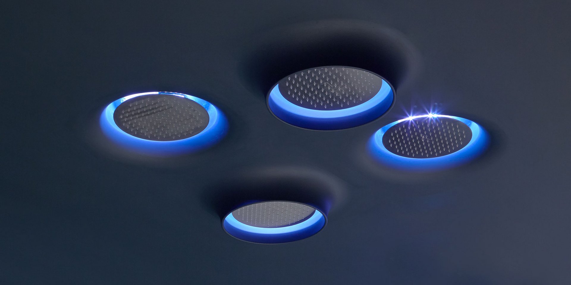Encased Flumood? frame with stainless steel AISI 304 showerhead, with possible LED RGB lighting complete with waterproof remote control.