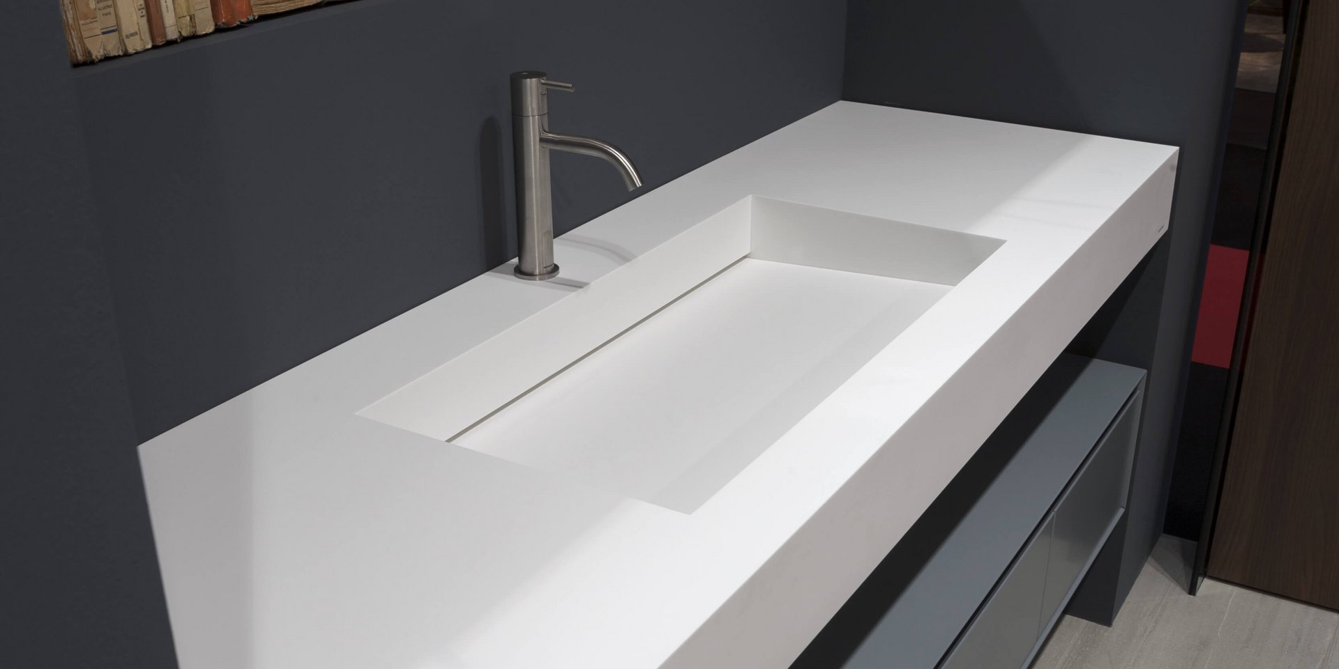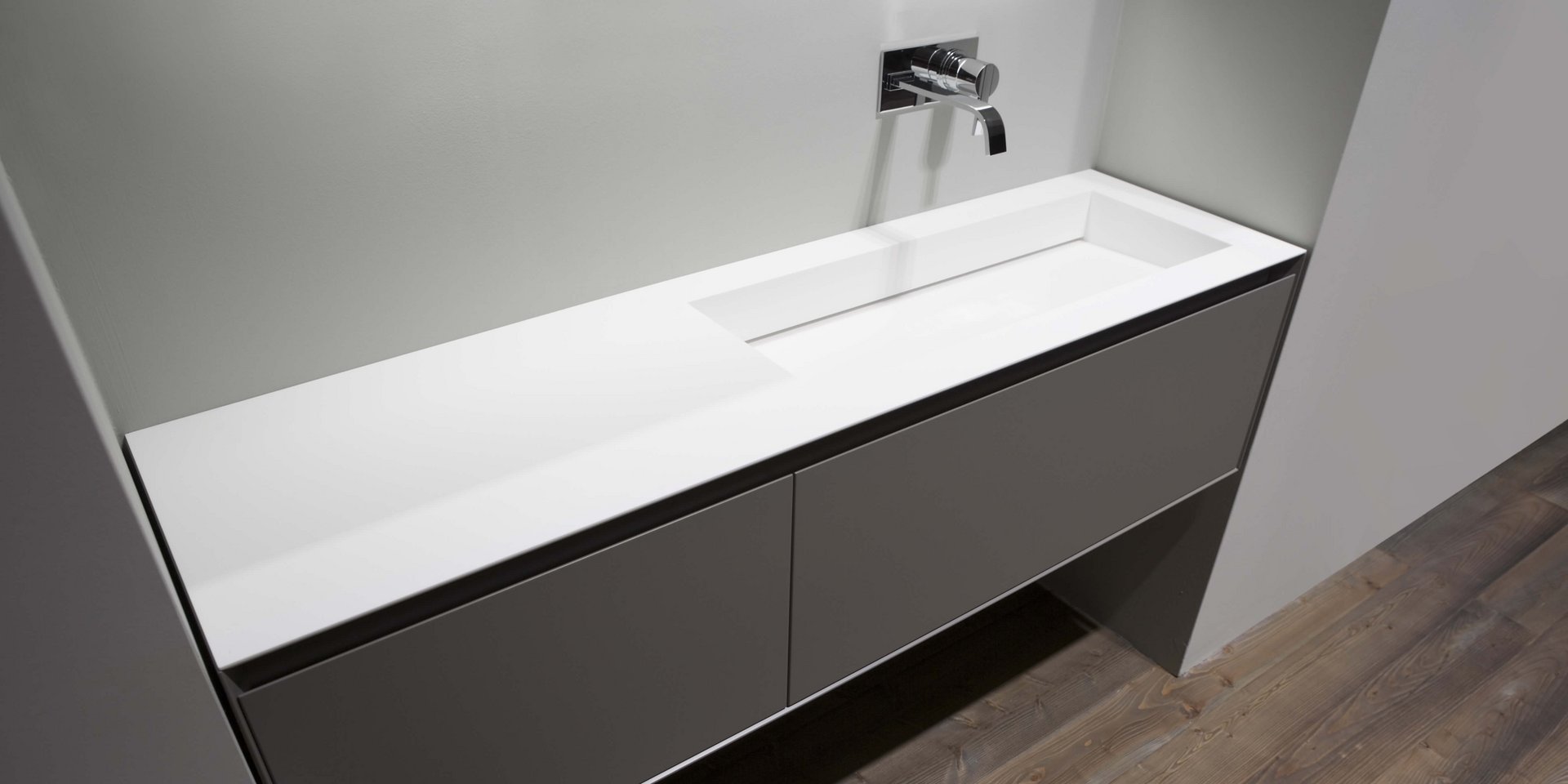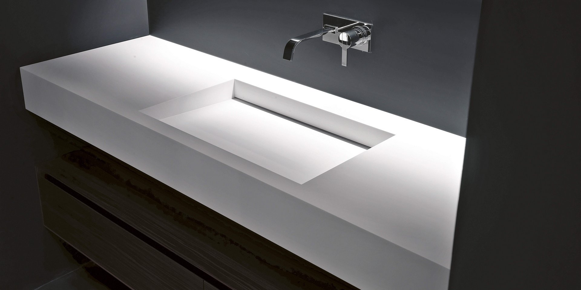 Top with integrated sink completely in Corian 12 mm thick, with drain prepared for siphon.