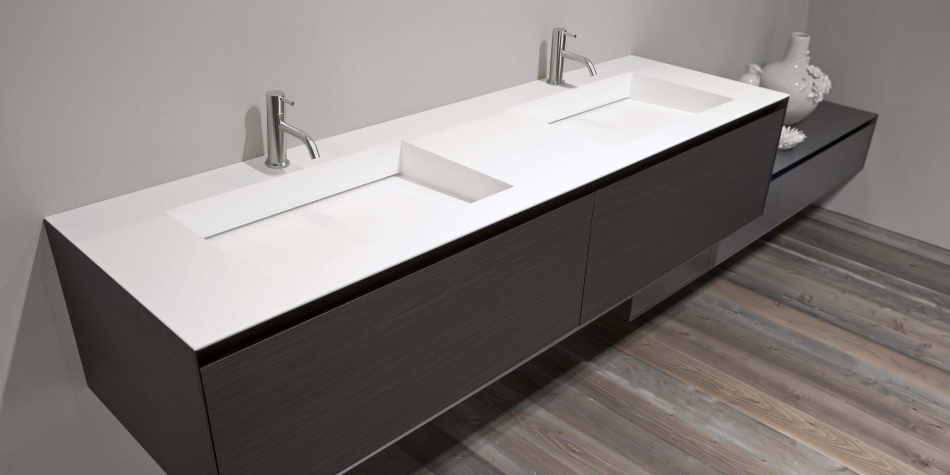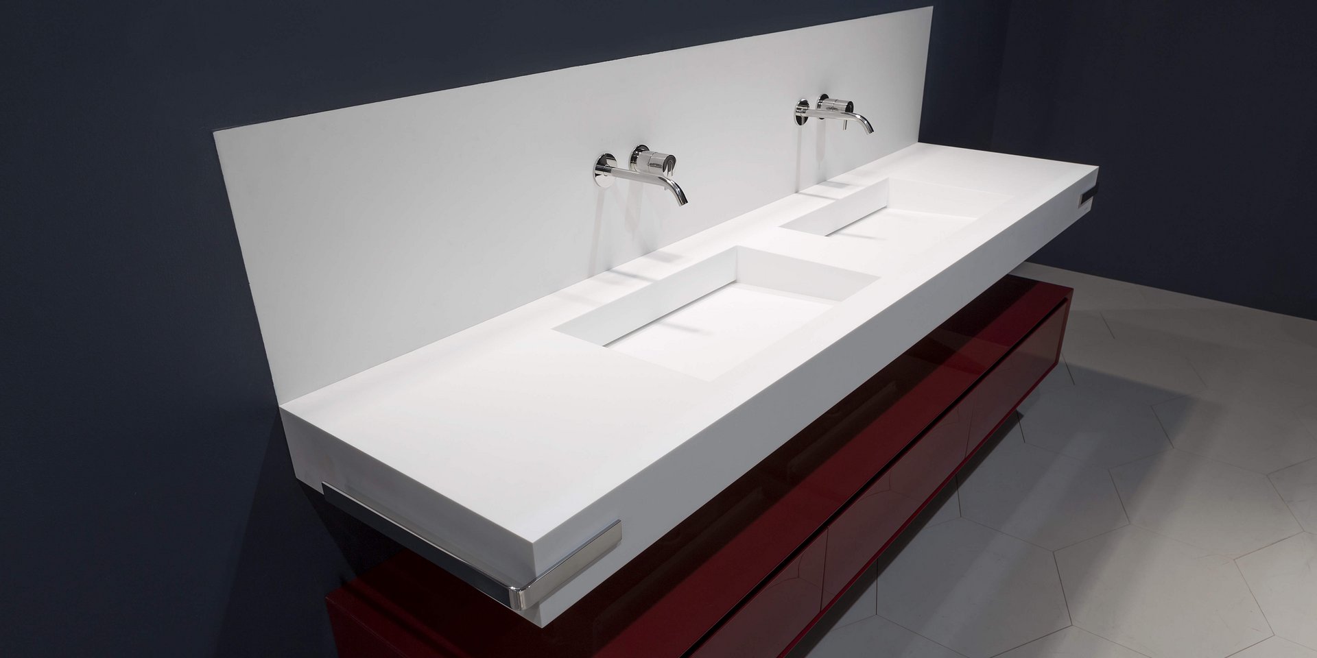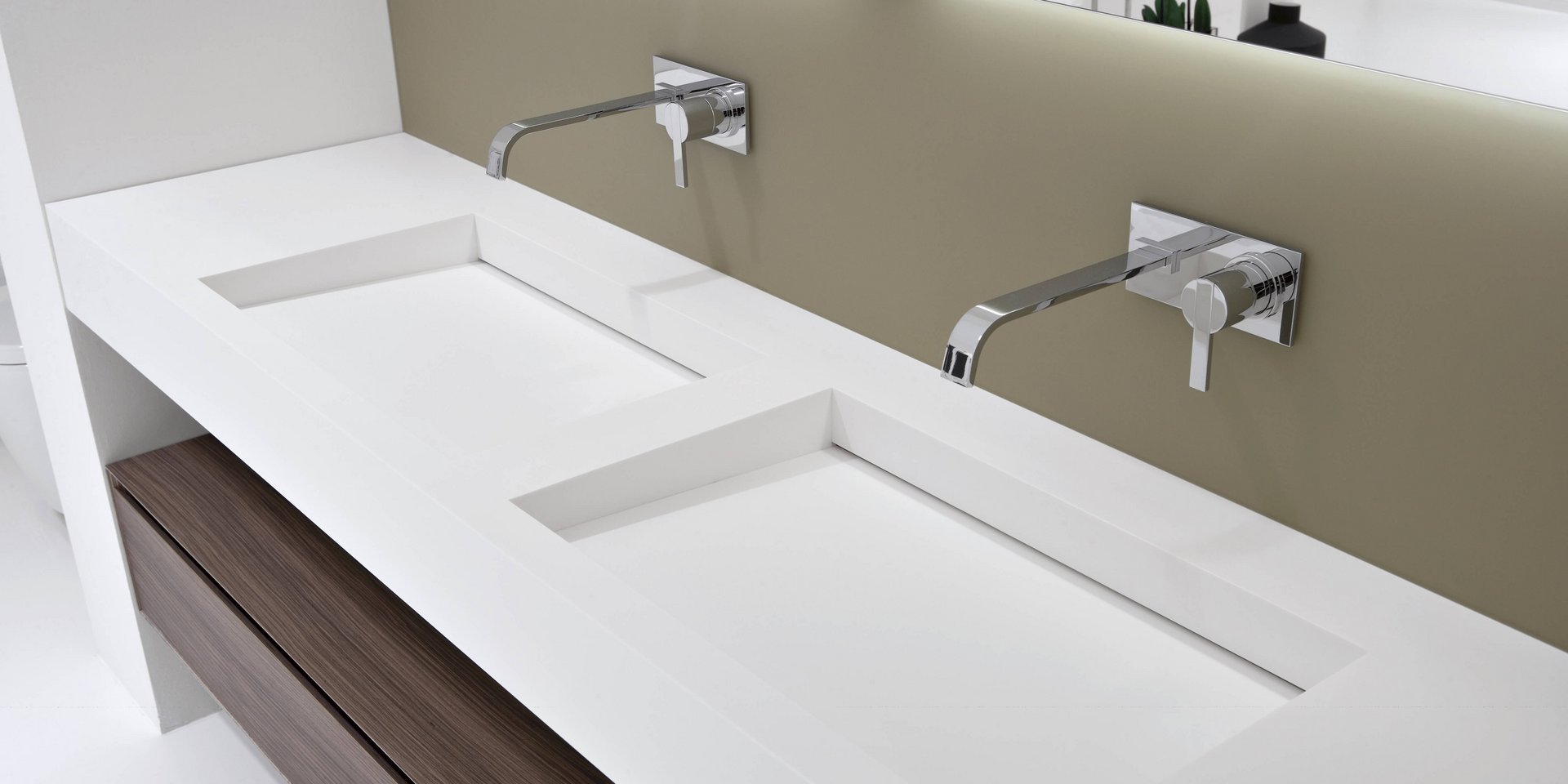 Top with integrated sink completely in Corian 12 mm thick, with drain prepared for siphon.