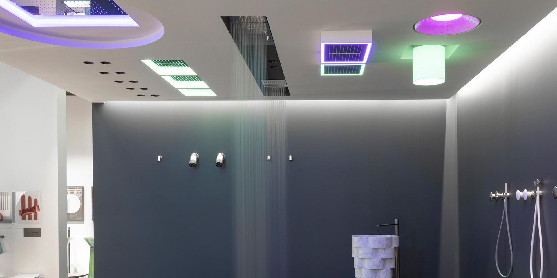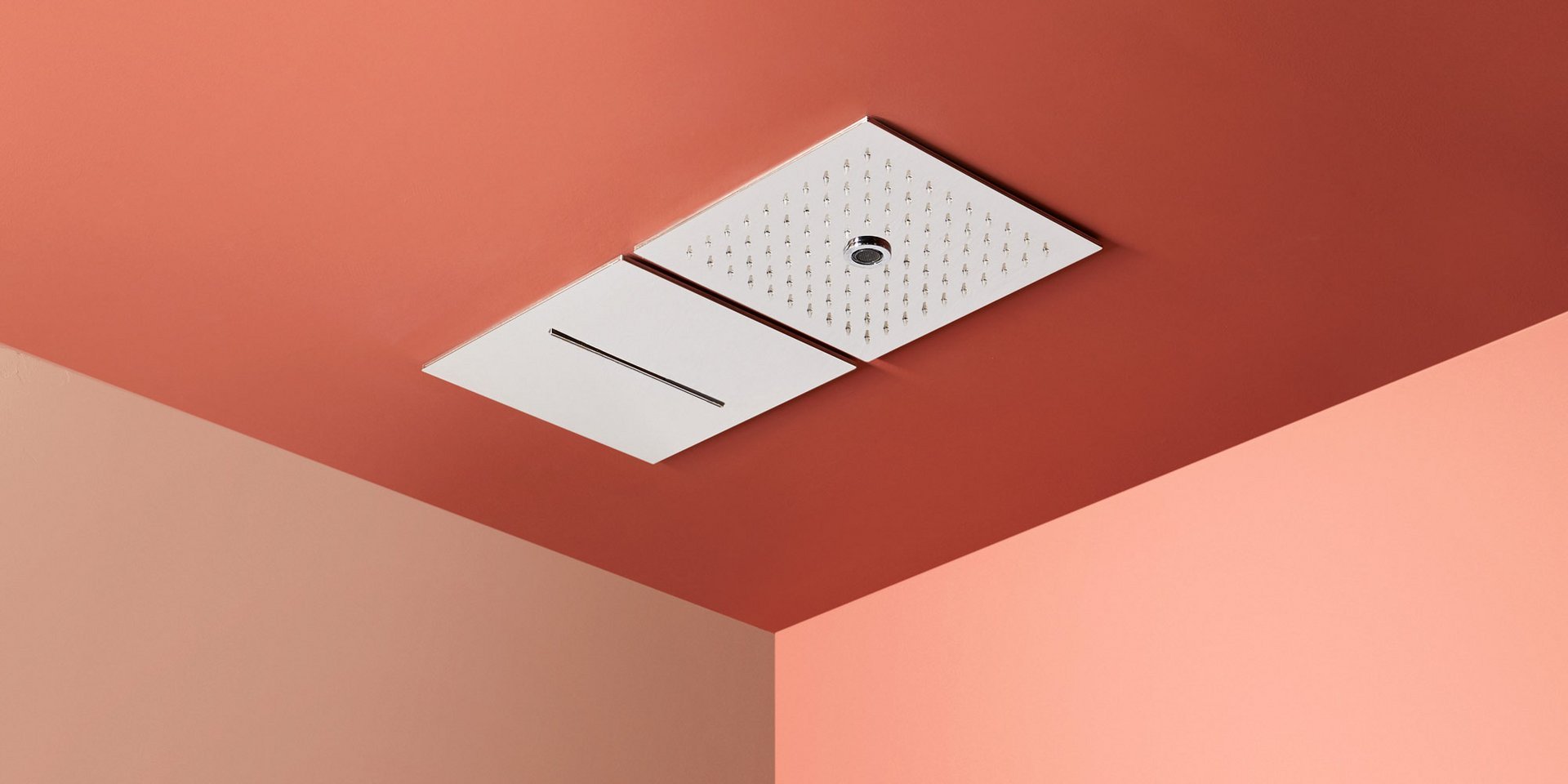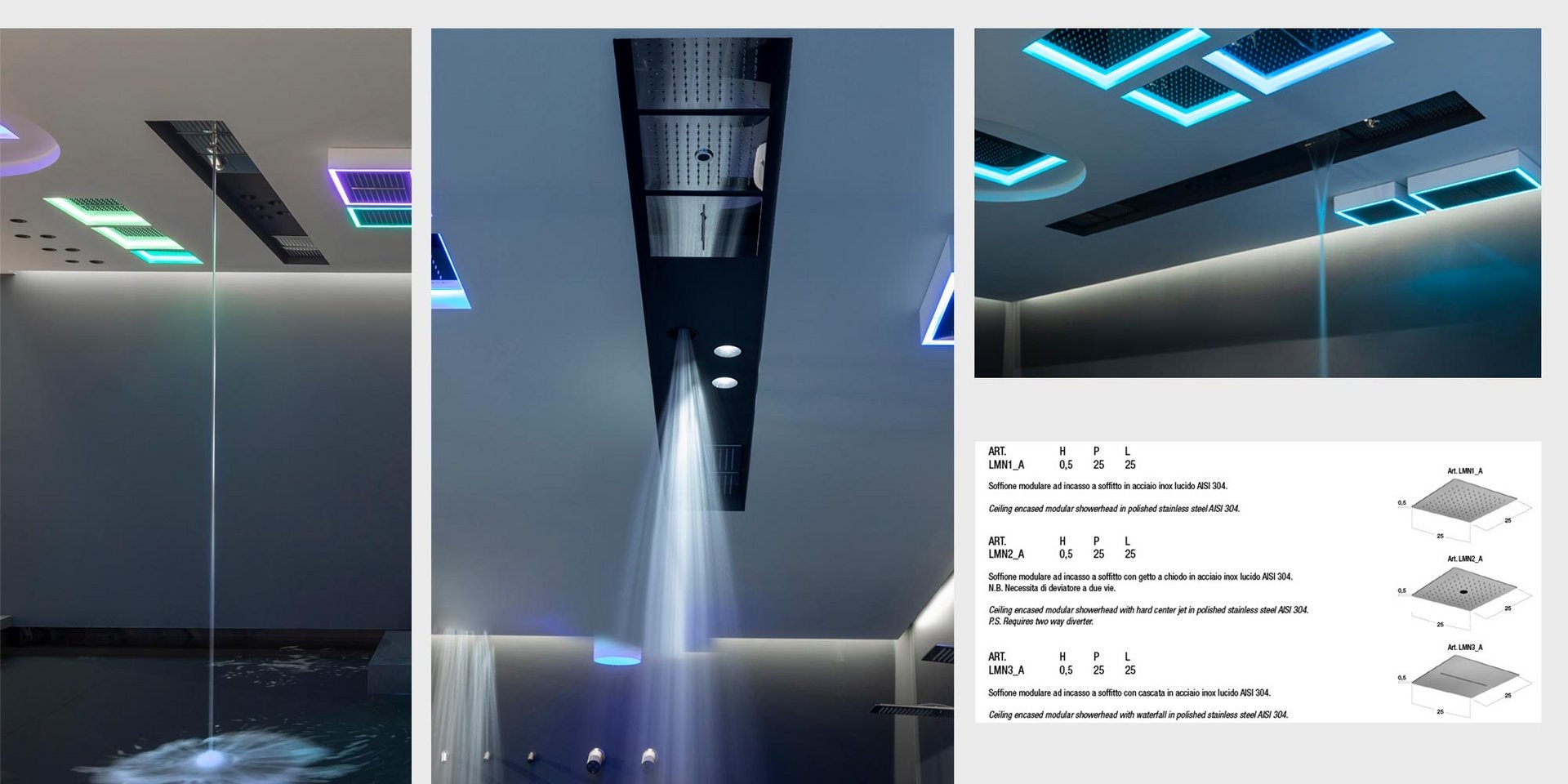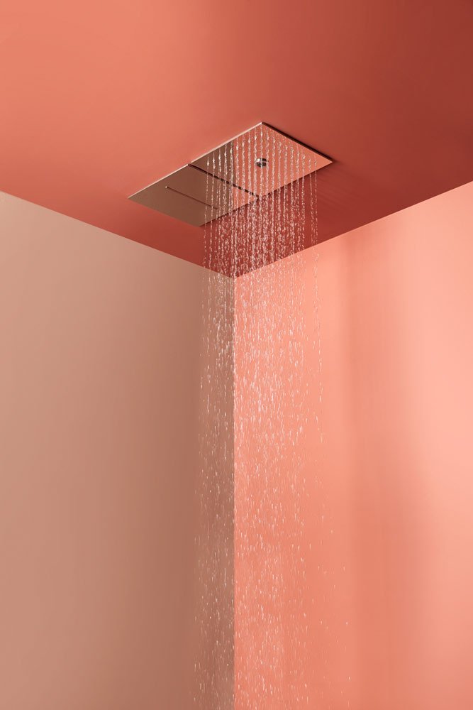 Encased modular showerhead with hard center jet in polished stainless steel AISI 304.
