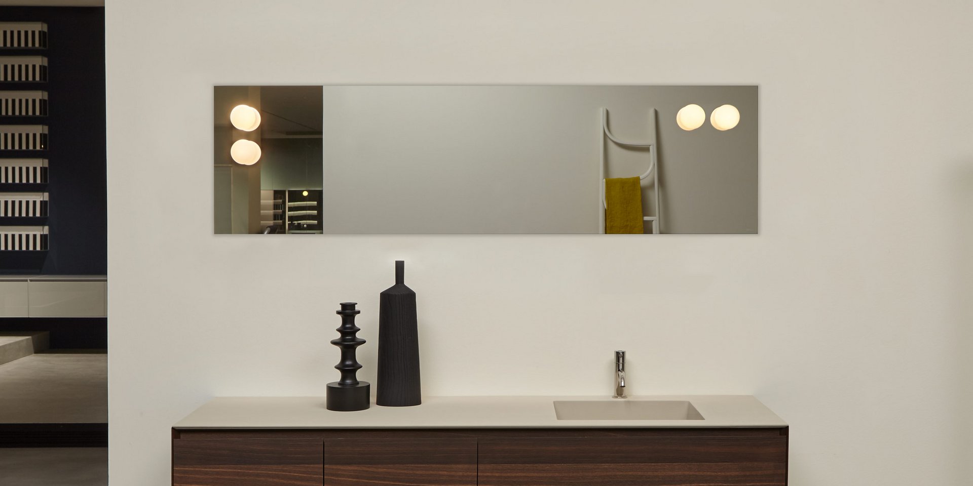 Polished edge mirror mounted horizontally or vertically, complete with black frame.