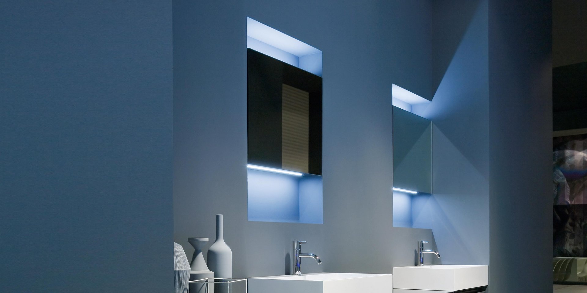 Wall cabinet with 2 double face mirrored doors and 1 internal shelf for H 50 cm or with 2 internal shelves for H 75 and H 90 cm.