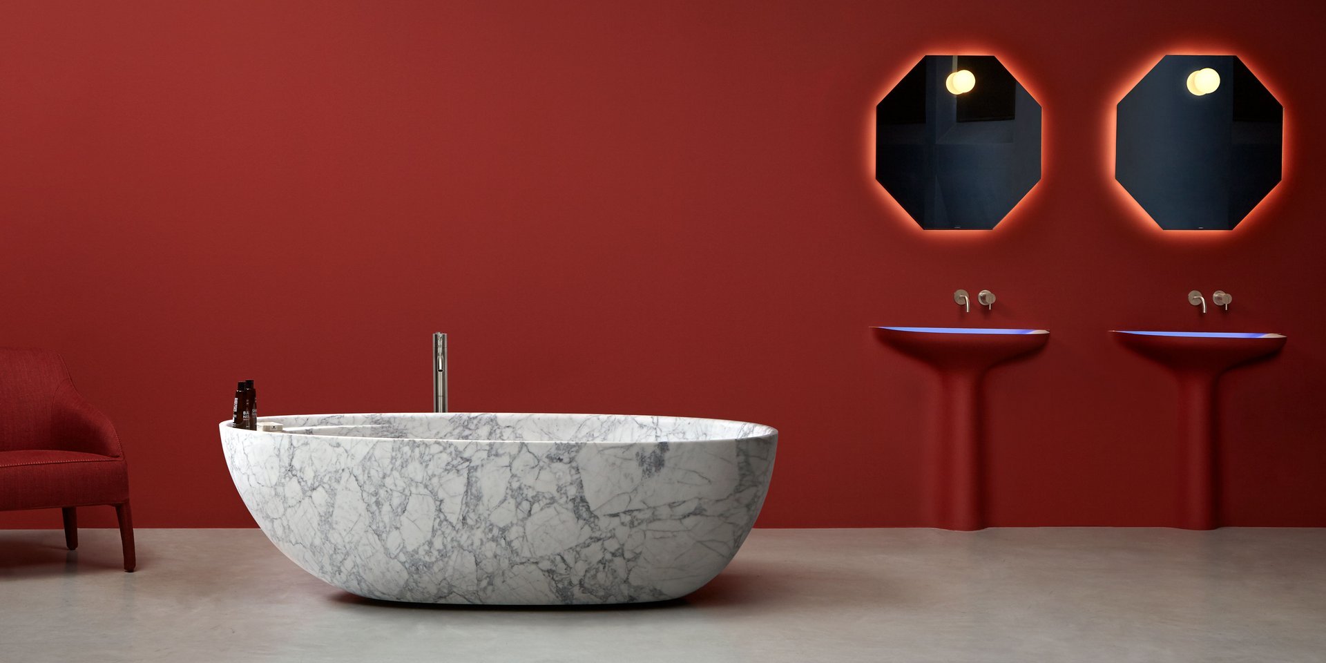 Oval bathtub in Carrara Marble complete with drain pipe fitting and pressure plug, siphon and flexible hose