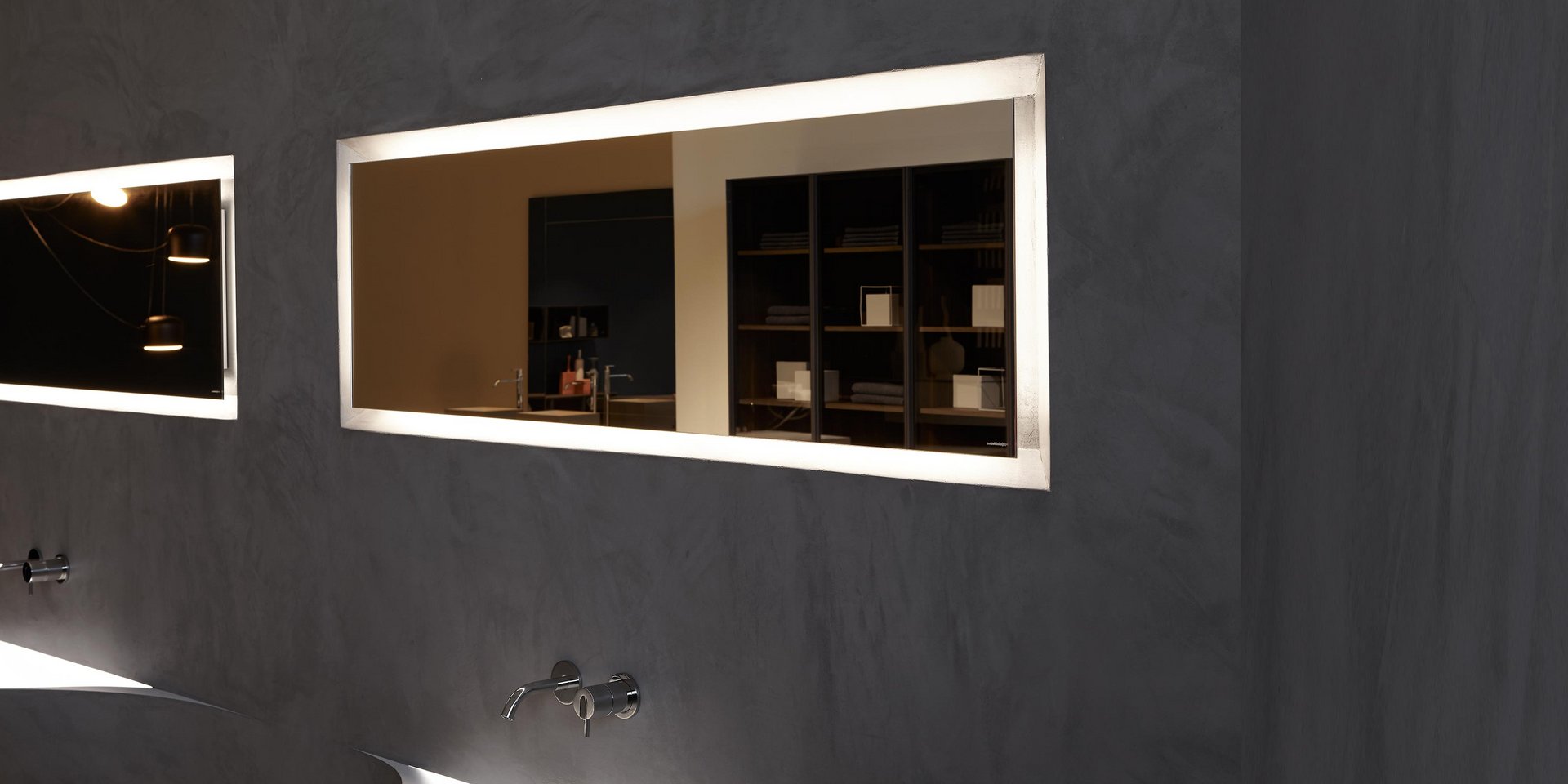 Encased wall mount polished edge mirror with white led lighting, mounted horizontally or vertically.