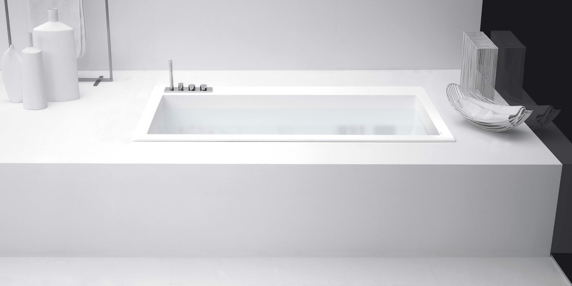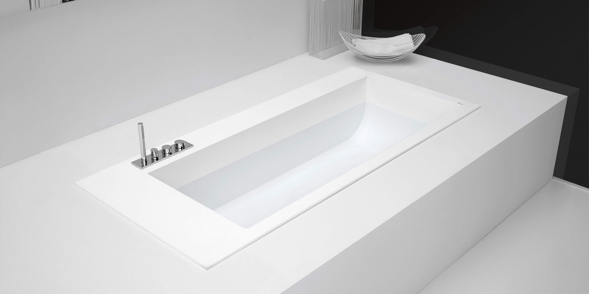 BIBLIO11 :Encased rectangular Corian bathtub, complete with regulating feet and drain with pressure plug.Dimensions cm 180 x 80 x 53,5