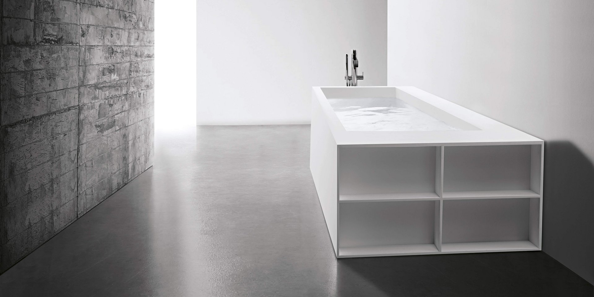 Rectangular Corian bathtub with front open shelves, complete with regulating feet and drain with pressure plug.