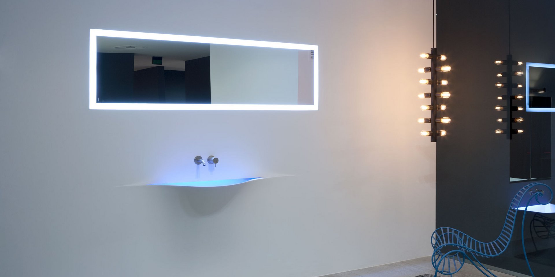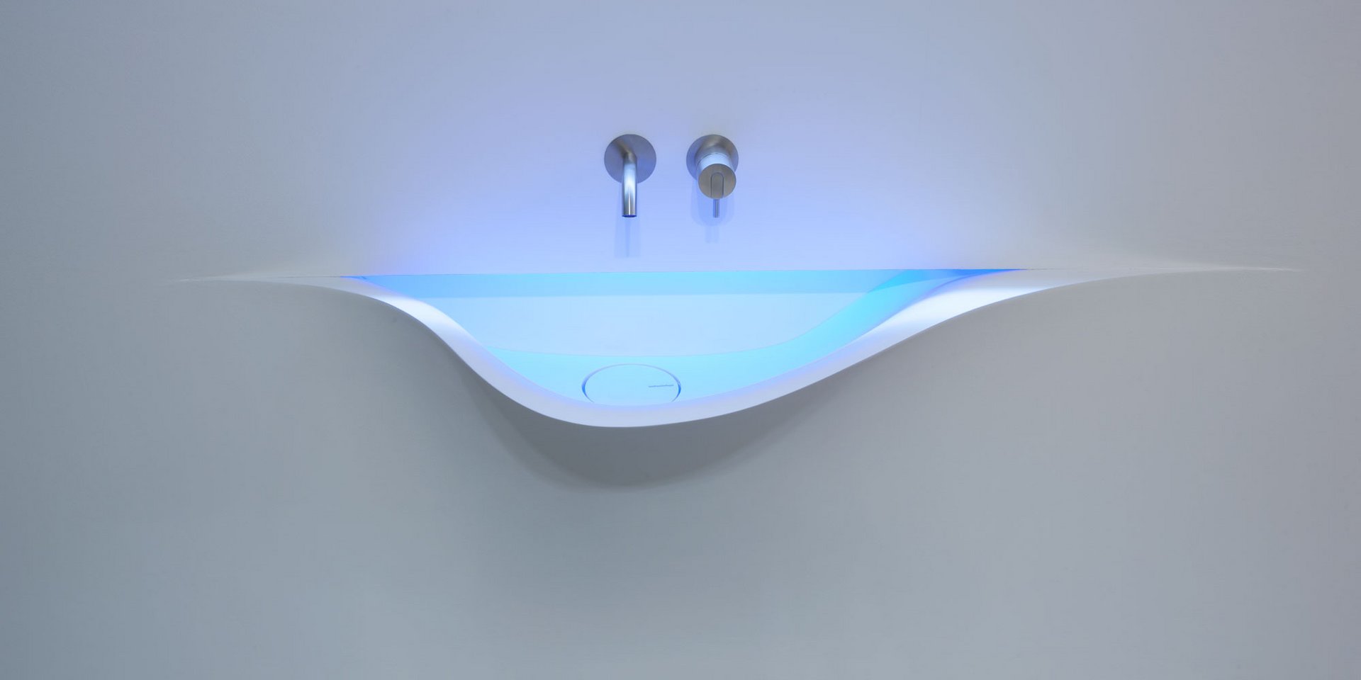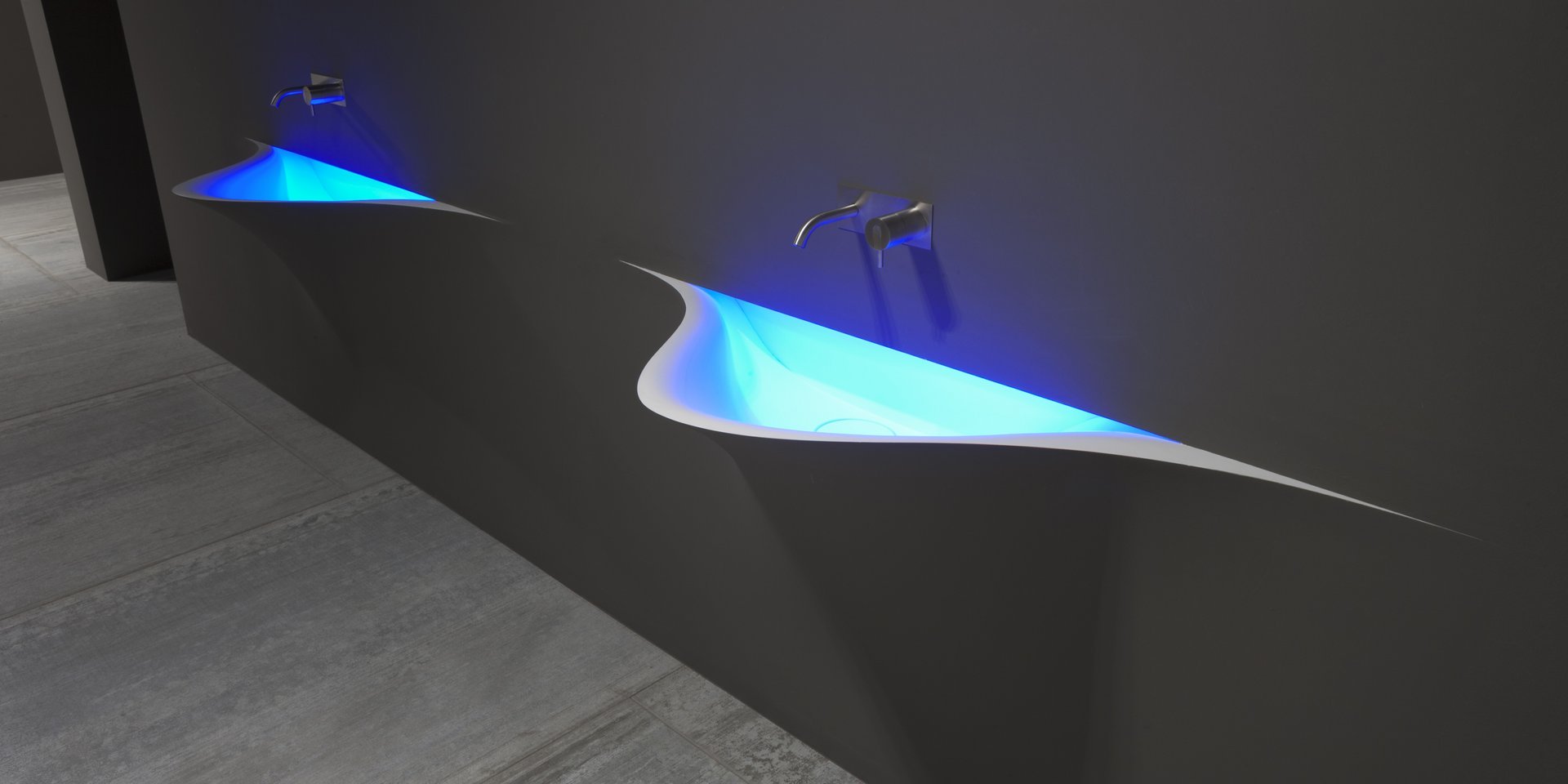 Encased Corian sink with or without led lighting, complete with inspectable drain, trap and flexible hose.