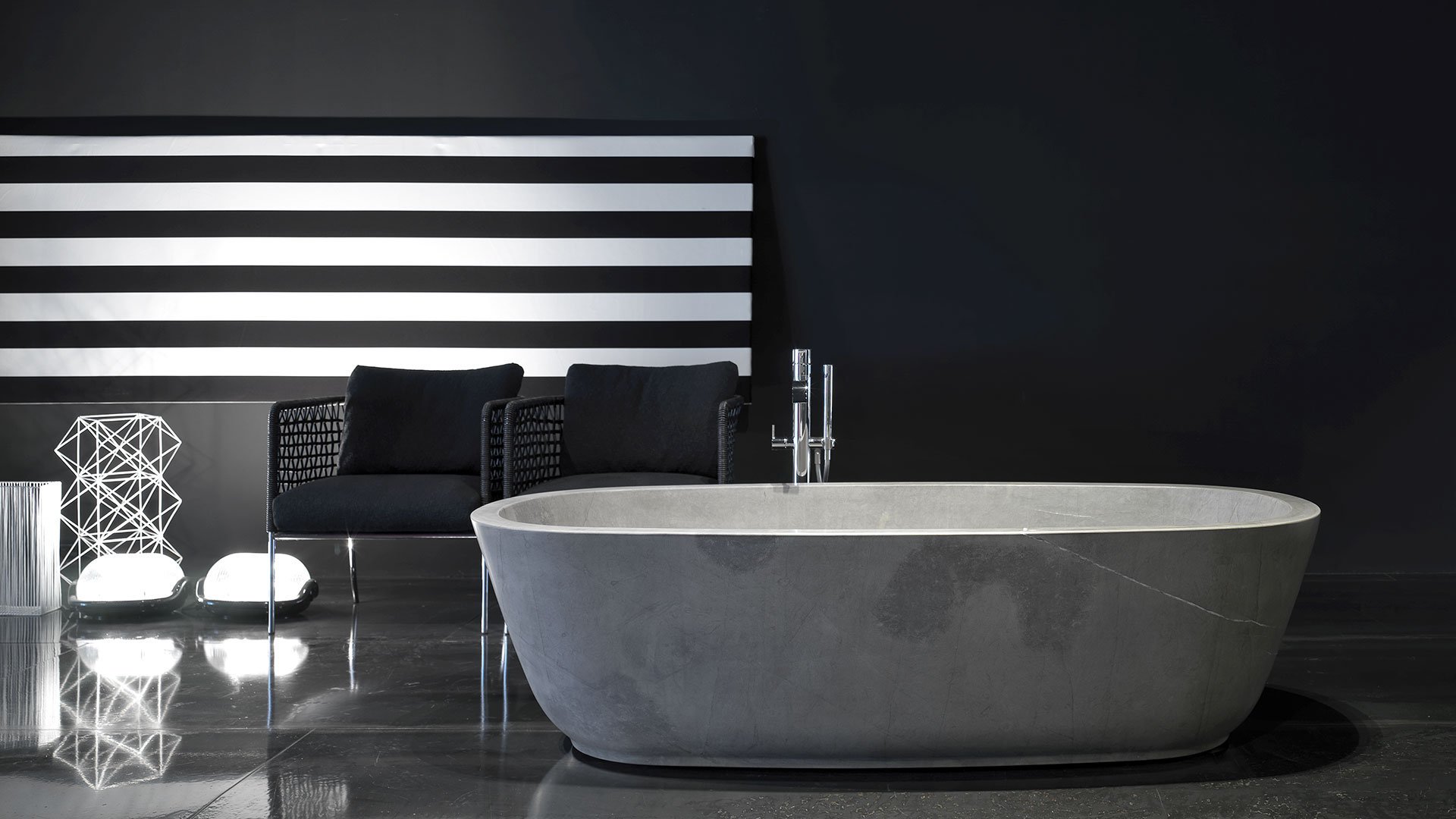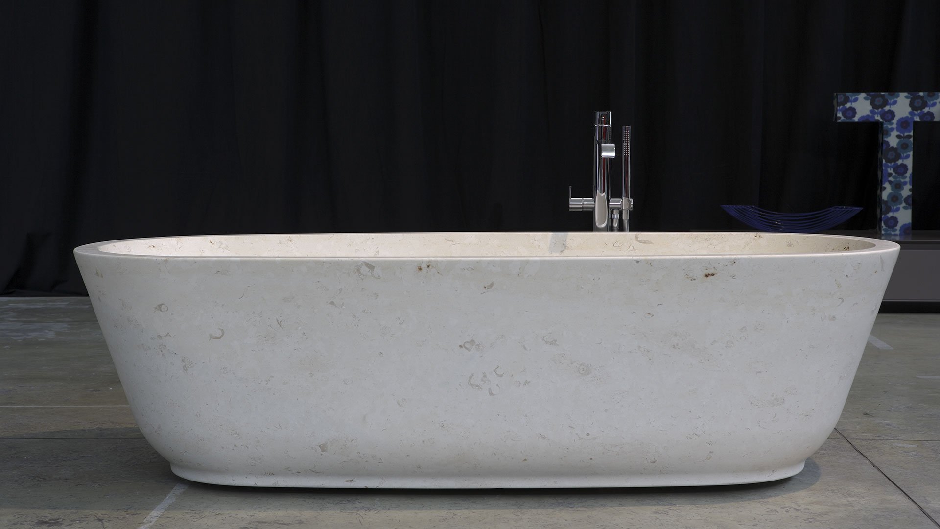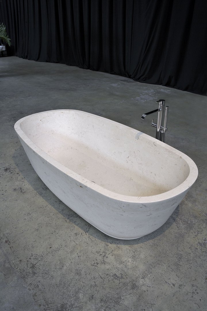 Oval stone bathtub complete with drain and pressure plug.