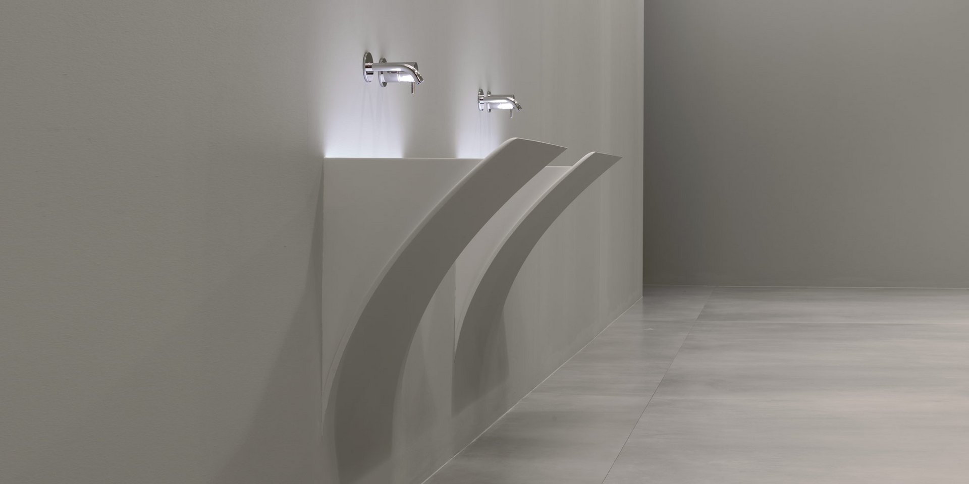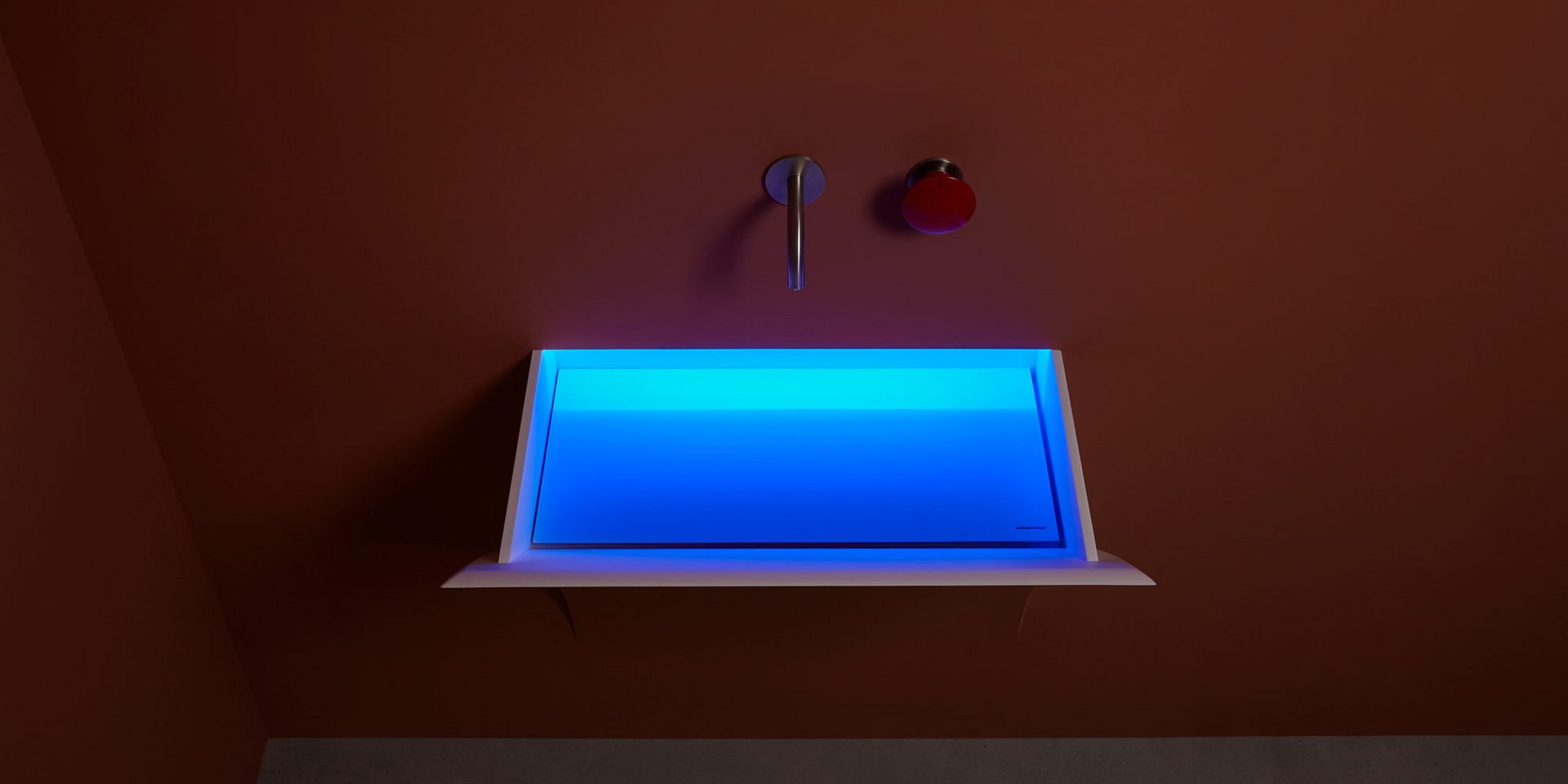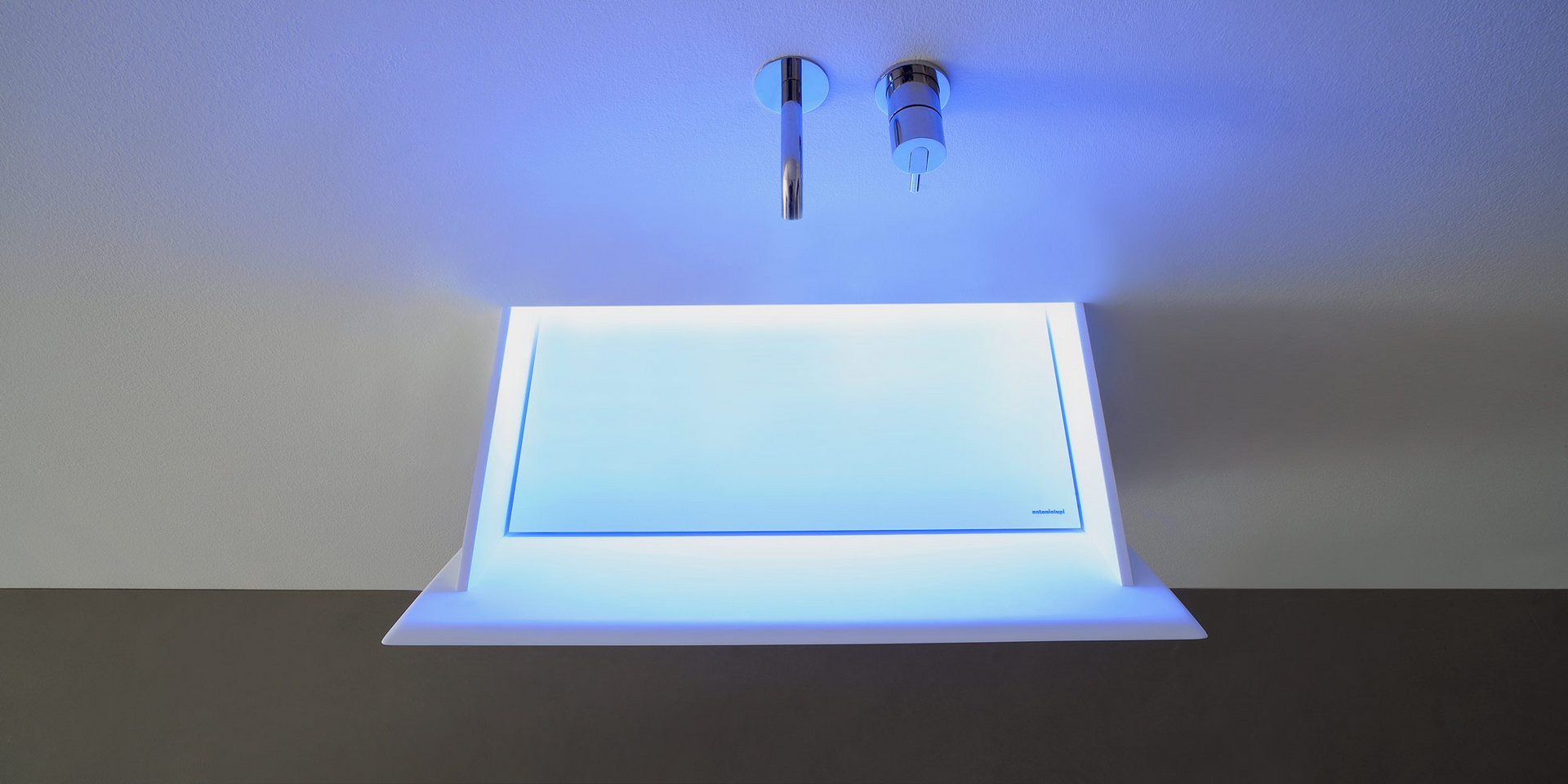 Encased Corian sink with or without led lighting, complete with inspectable drain, trap and flexible hose.