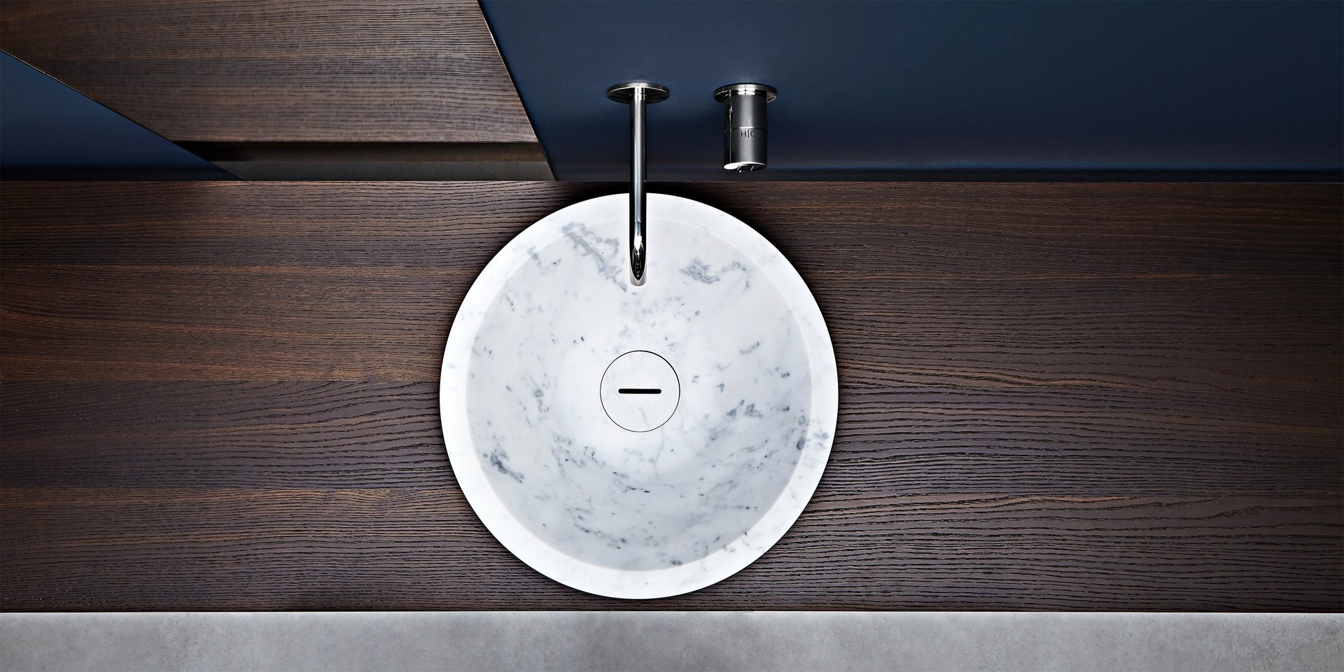 Round top mount stone sink complete with drain pipe fitting and open plug.