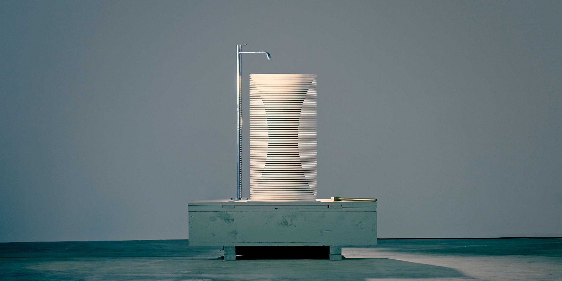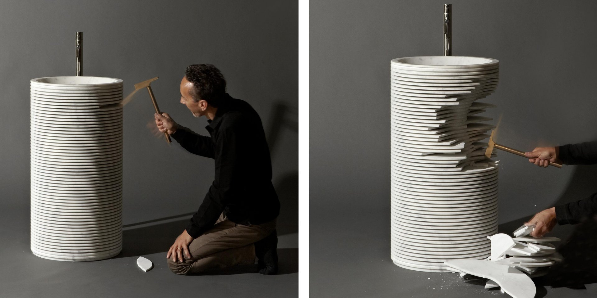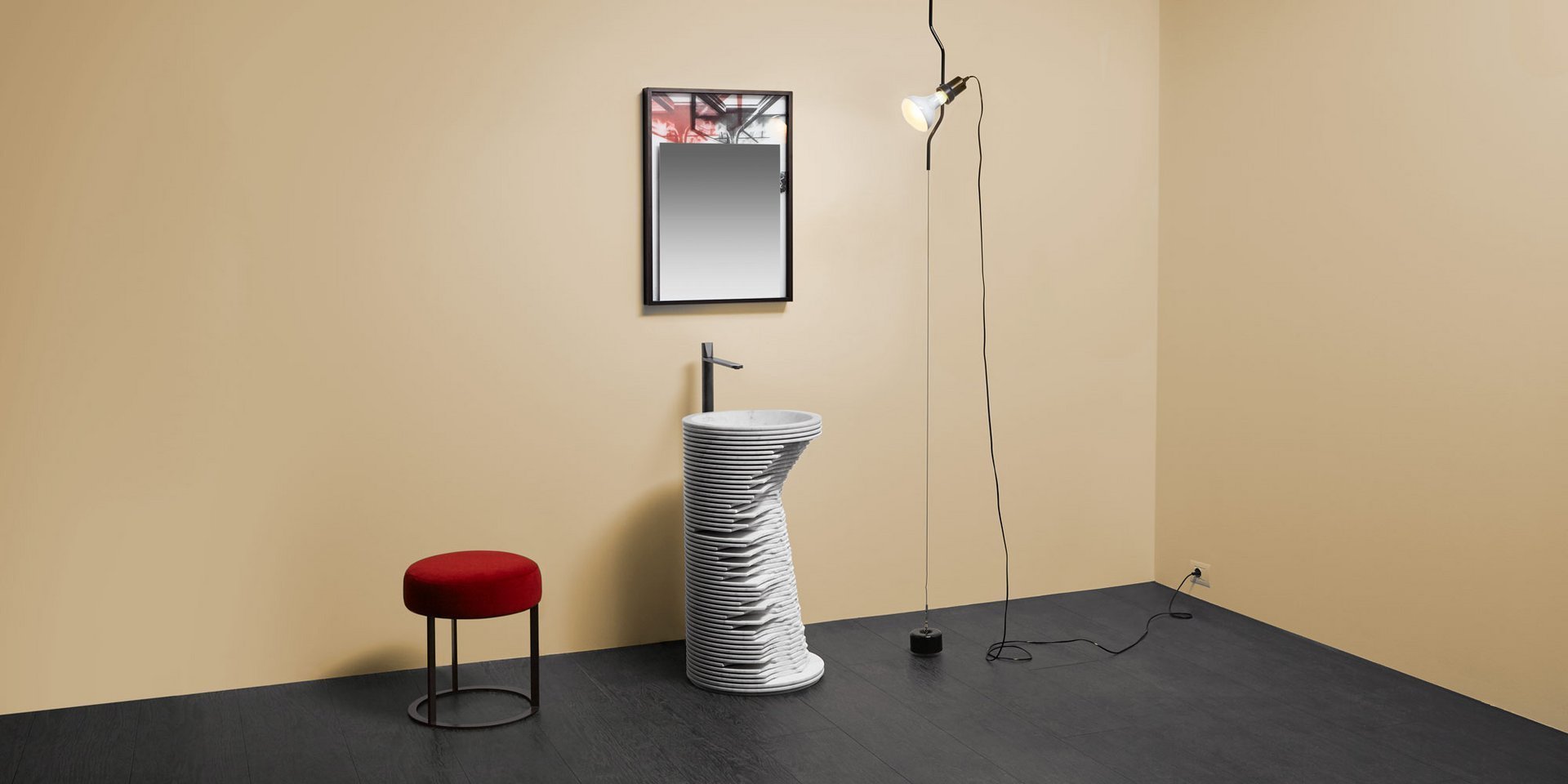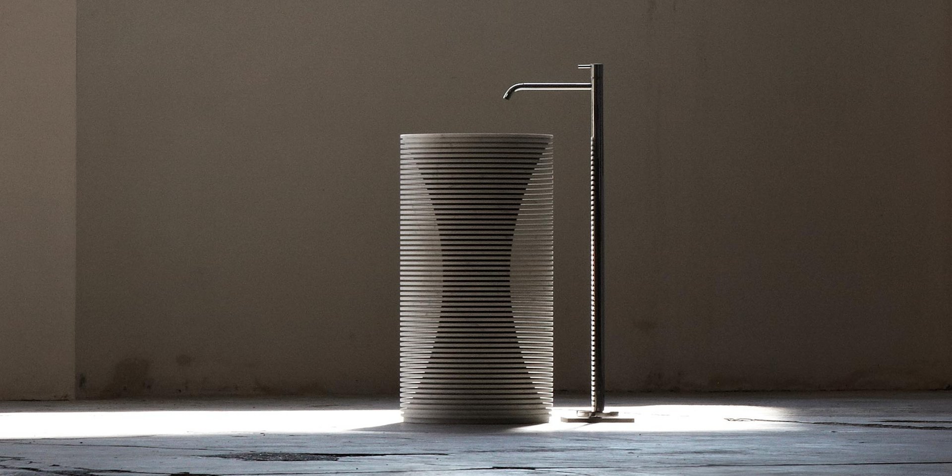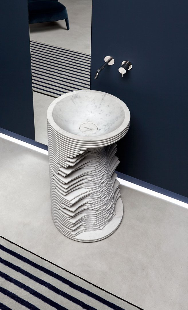Freestanding stone sink, complete with drain pipe fitting and open plug, trap and flexible hose