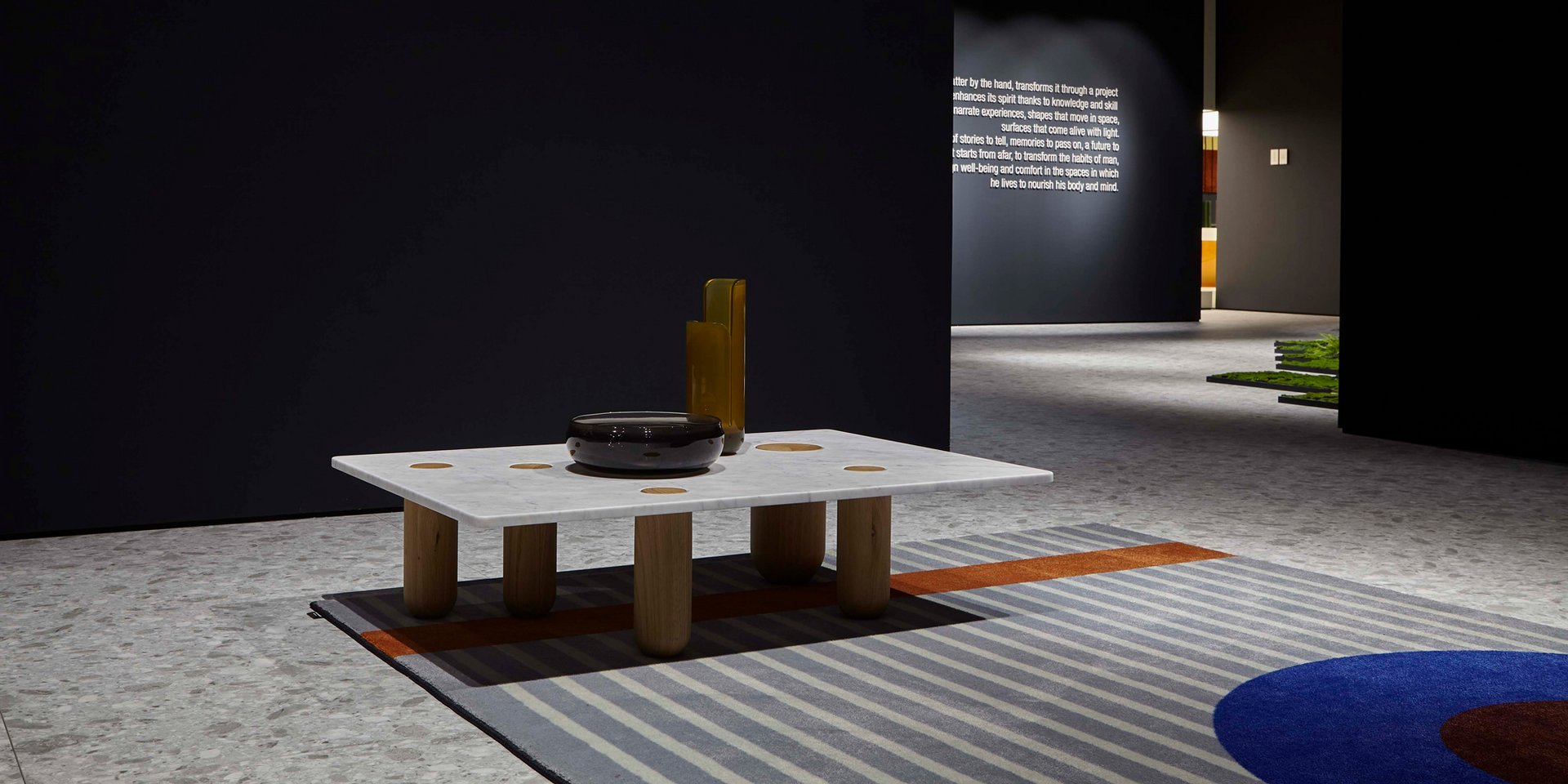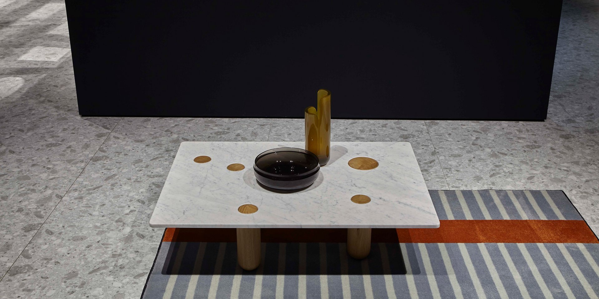 White Carrara marble coffee table with solid oak legs finish Rovere naturale.