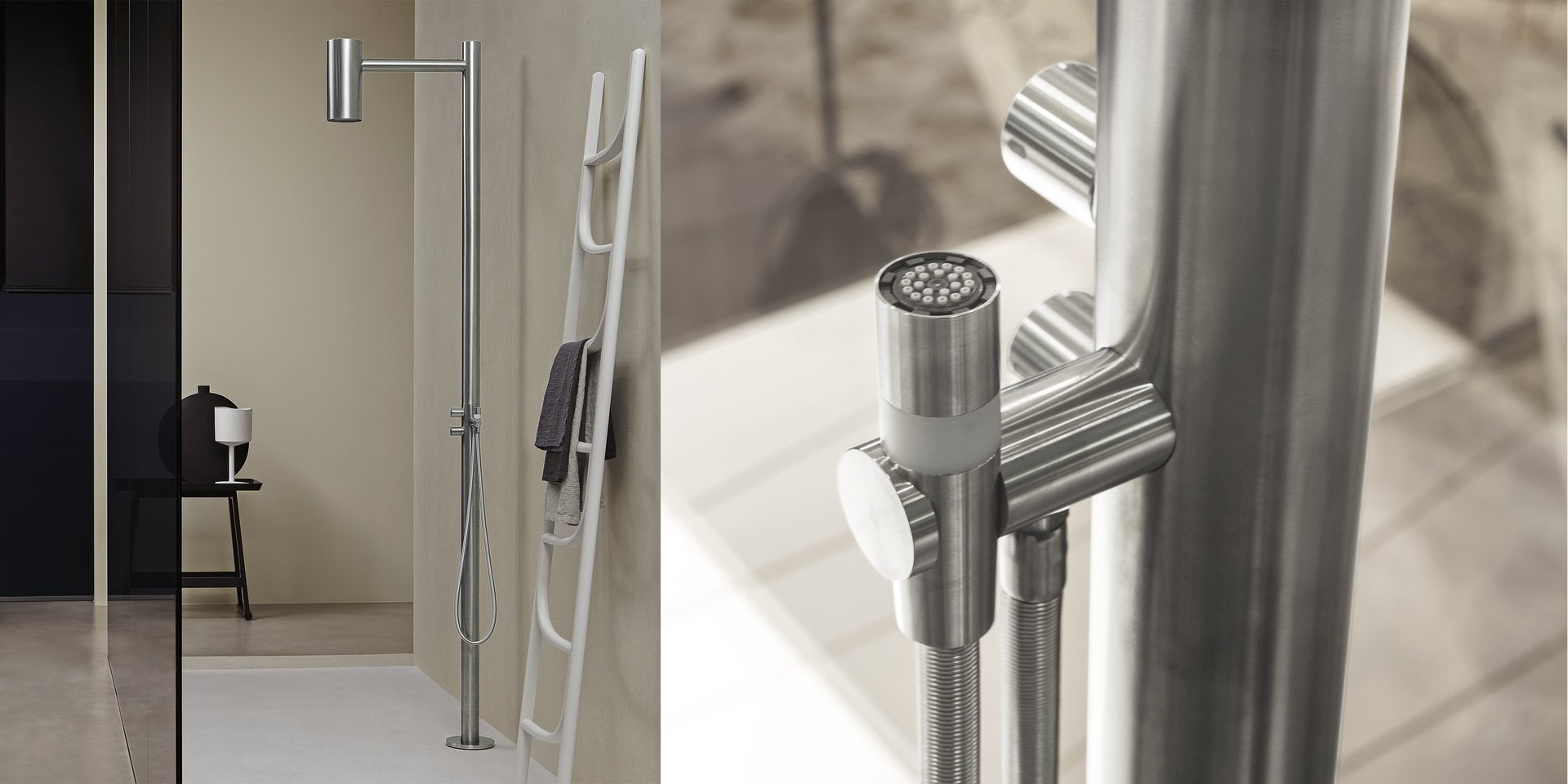 Freestanding shower for internal and external use, in stainless steel complete with concealed valve, overhead shower, mixer, waterproof remote control with two way diverter and hand shower with hose 150 cm.