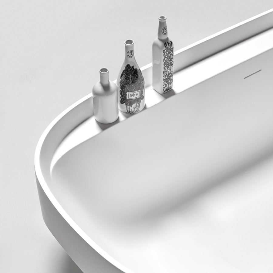 正是這個低邊緣支撐著大體積,成為一個實用的支撐表面,可以在上面存放身體護理所需的物品。最終定義浴缸整體形象的功能性細節,賦予形狀動感和活力。