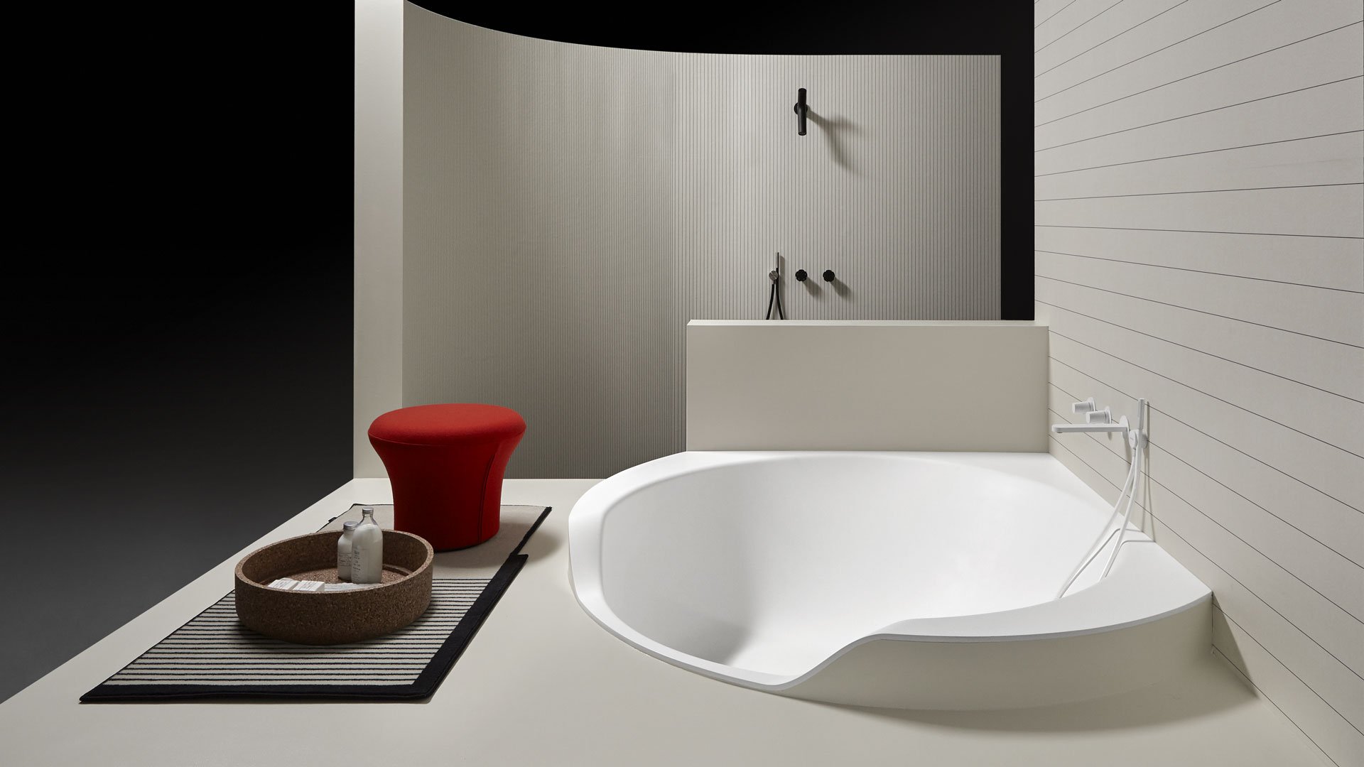 Ofuro 是一款嵌入式或獨立式浴缸,源自對 1970 年代項目的現(xiàn)代改造。一個塑料模型、一個大型雕塑、一個浴缸,它們似乎是由一塊塊制成的,經過加工、手工切割或被水的自然力侵蝕。直線和鋒利的邊緣與柔軟的形狀和曲面的共存使構圖變得有價值,也允許考慮它的角落位置。