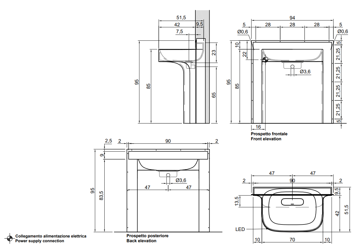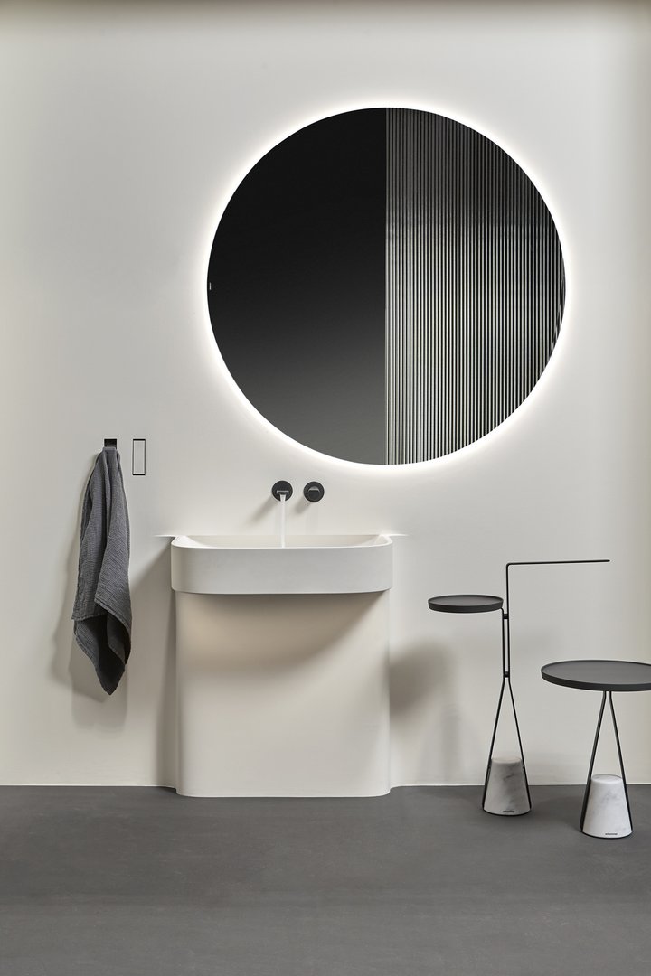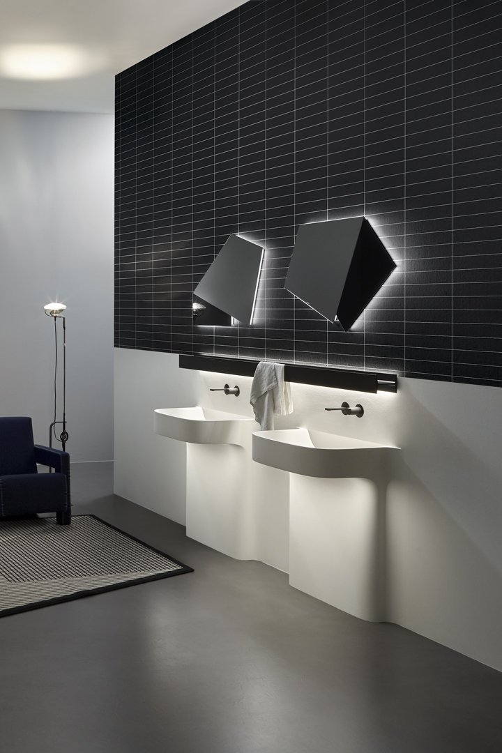 Fluido 的整體形象由柱子的寬度決定,柱子反映了盆地的尺寸,與盆地融為一體。水槽完全由 Flumood 制成,由于集成的燈光,表現出其雕塑般的形狀。用于注意體積、高度和深度尺寸的基本工具。細節上,除了水槽上方的“經典”燈飾外,Fluido還額外增加了一盞從水槽下方射出的迎賓燈,為整體增添魅力。