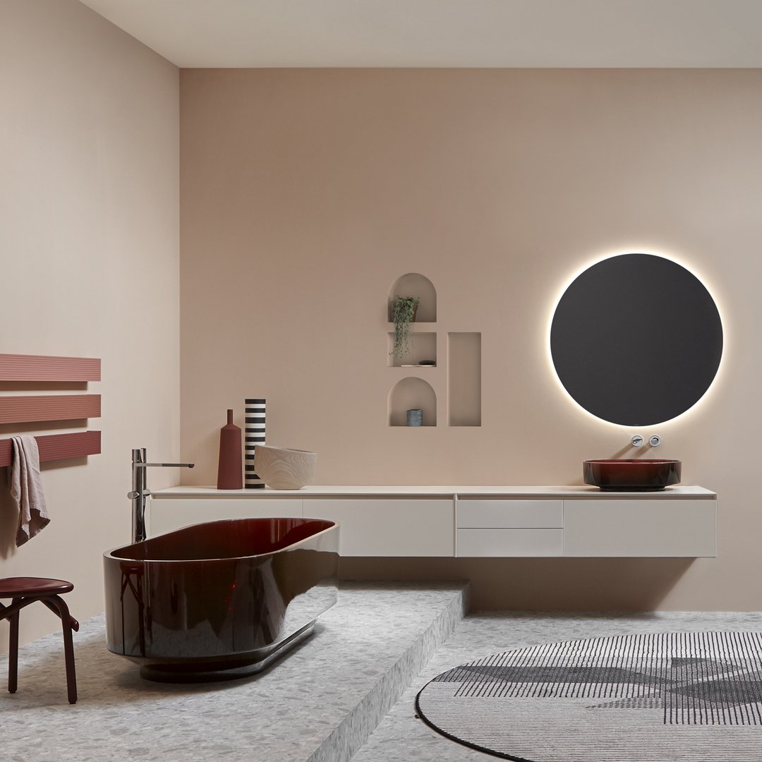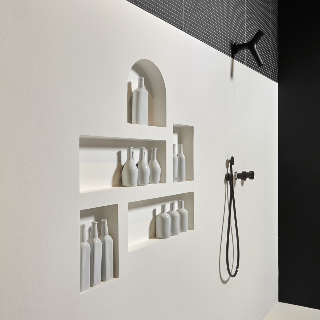 純粹的幾何形狀,精致的比例平衡,完美嵌入墻壁。它延續了 antoniolupi 的研究路徑,超越垂直表面的二維性,探索外殼與提供空間的元素之間的整合潛力。