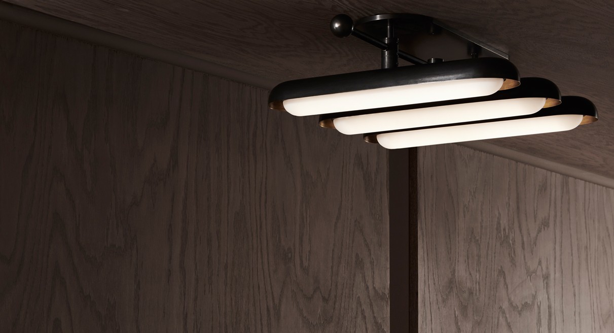 THE CIRCUIT SERIES CREATES RHYTHM WITH THE REPETITION OF PURE SHAPES. A GLOWING GLASS CAPSULE NESTS IN A BRASS SHADE, BECOMING A CONTAINED FORM THAT MULTIPLIES TO CONSTRUCT LARGER FIXTURES.