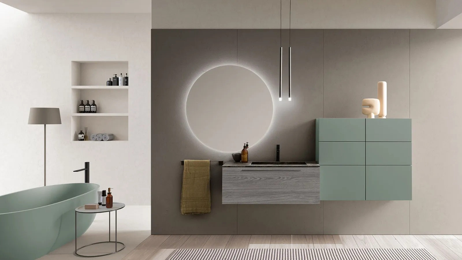 BASE PORTA LAVABO CON FRONTALE A "L" IN MEZZAFIAMMA GRIGIO CON MAN. M22 TITANIO E VANO LATERALE A GIORNO LACCATO GIADA OPACO COME LA COMPOSIZONE DI PENSILI AFFIANCATA - TOP IN GRES AMAZONICO SLATE CON VASCA GZZ5 - SPECCHIO RAGGIO CON LAMPADE TUBE NERE.