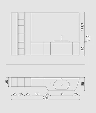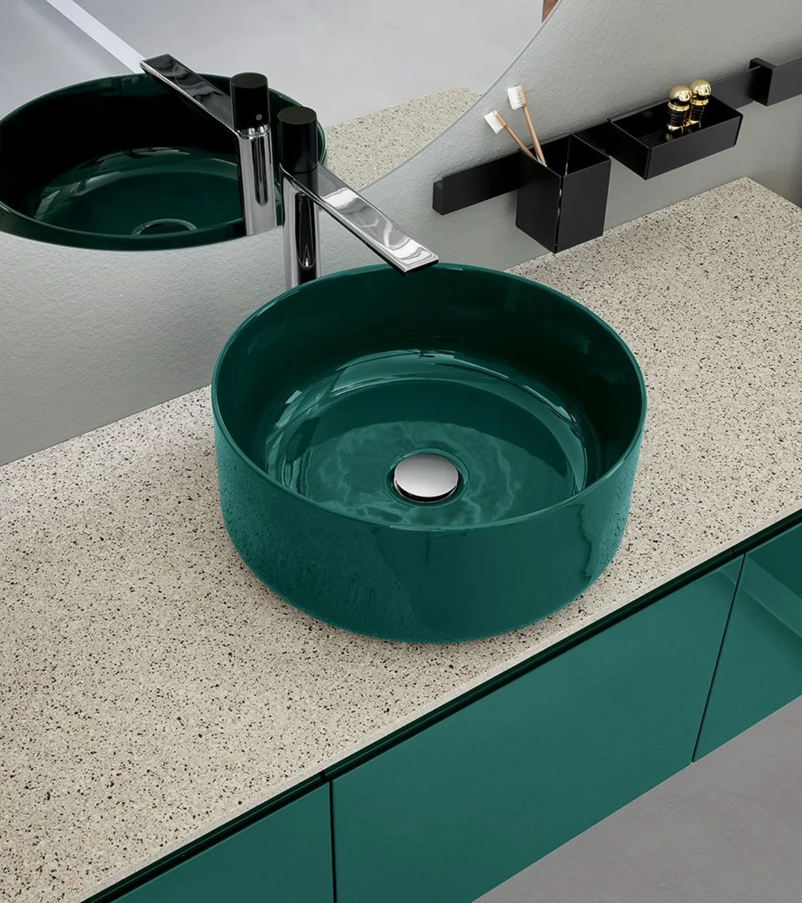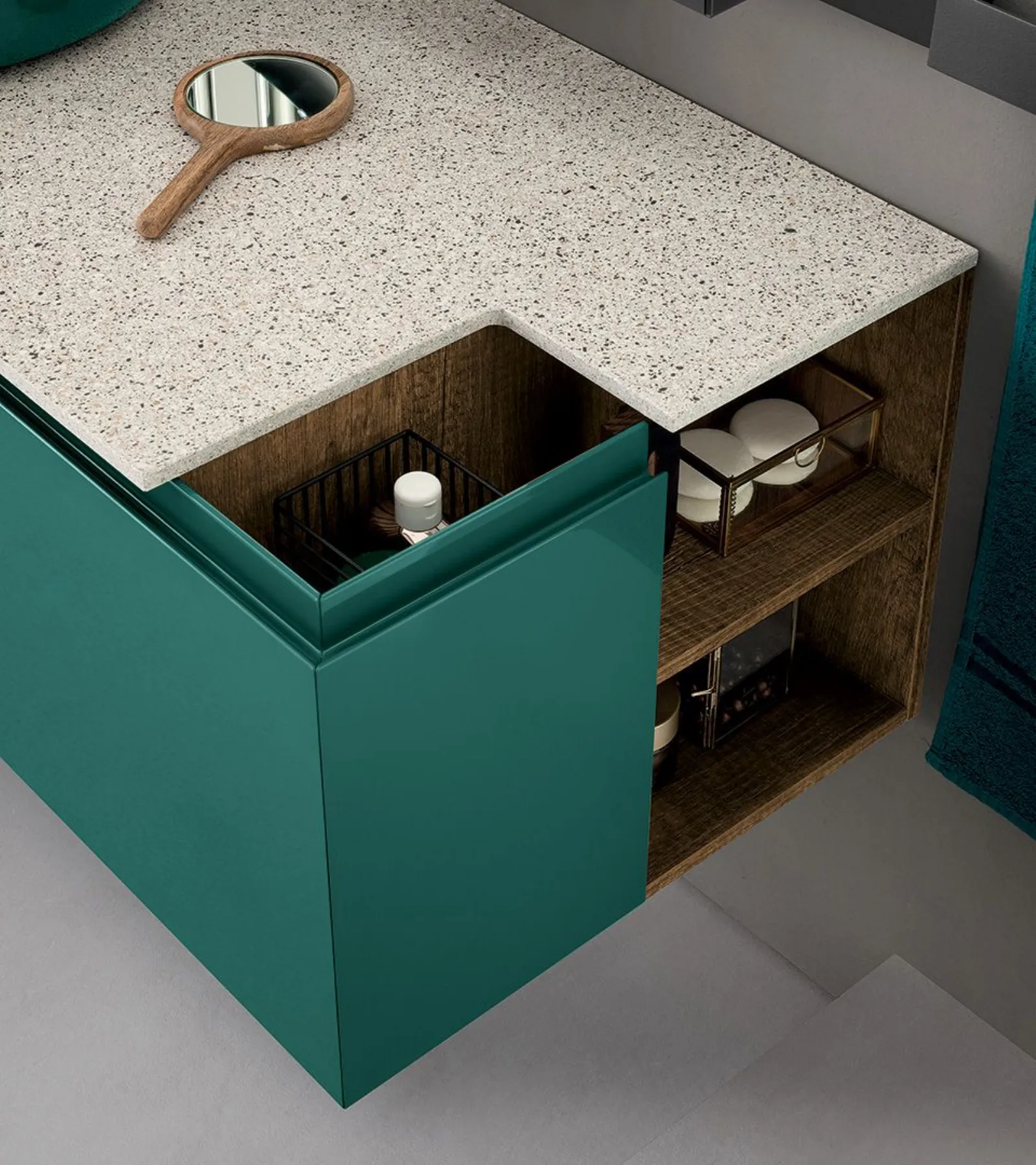 Laccato Canapa Opaco, elemento a giorno Laccato Grafite Opaco, top Deimos Stone texture Sabbia, lavabo incasso in Deimos Stone Sabbia, specchio profilo alluminio e lampada Clio Slim.