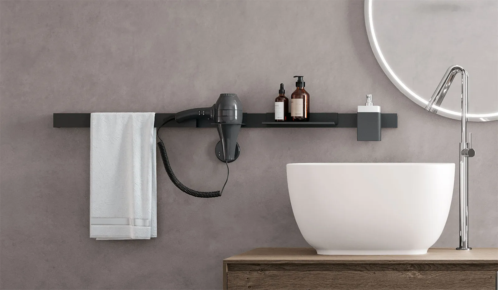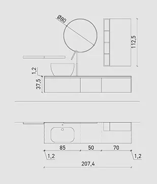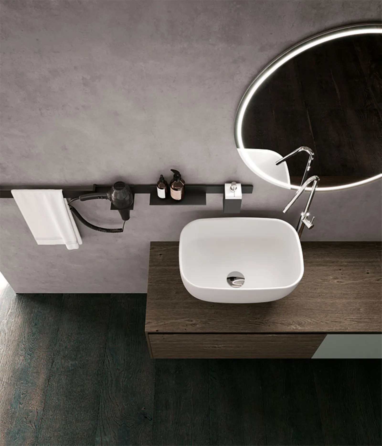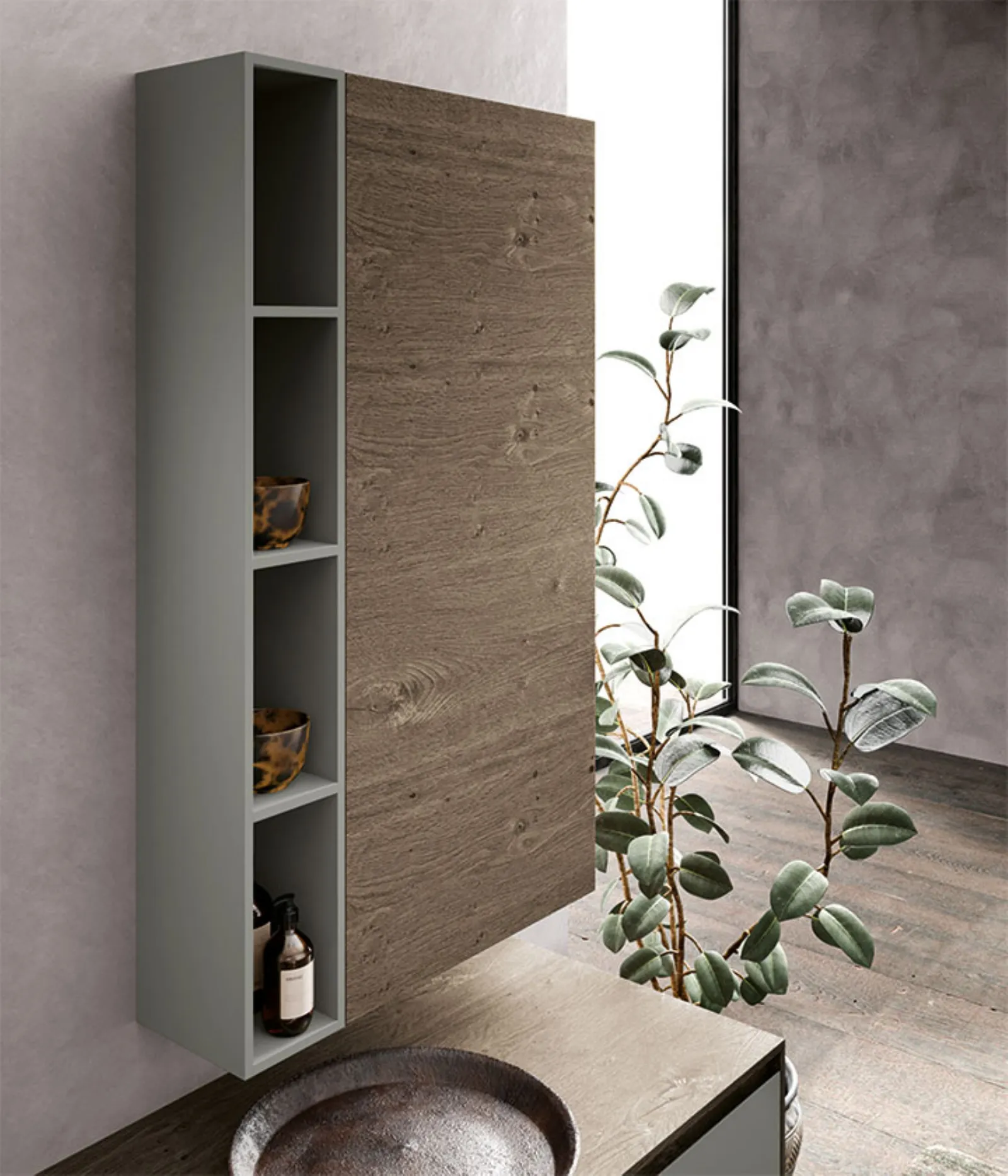 Impiallacciato Nordico Caffe? e laccato Giada opaco. Top Nordico Caffe? con lavabo Lady in Tecnoril, specchio Moon.