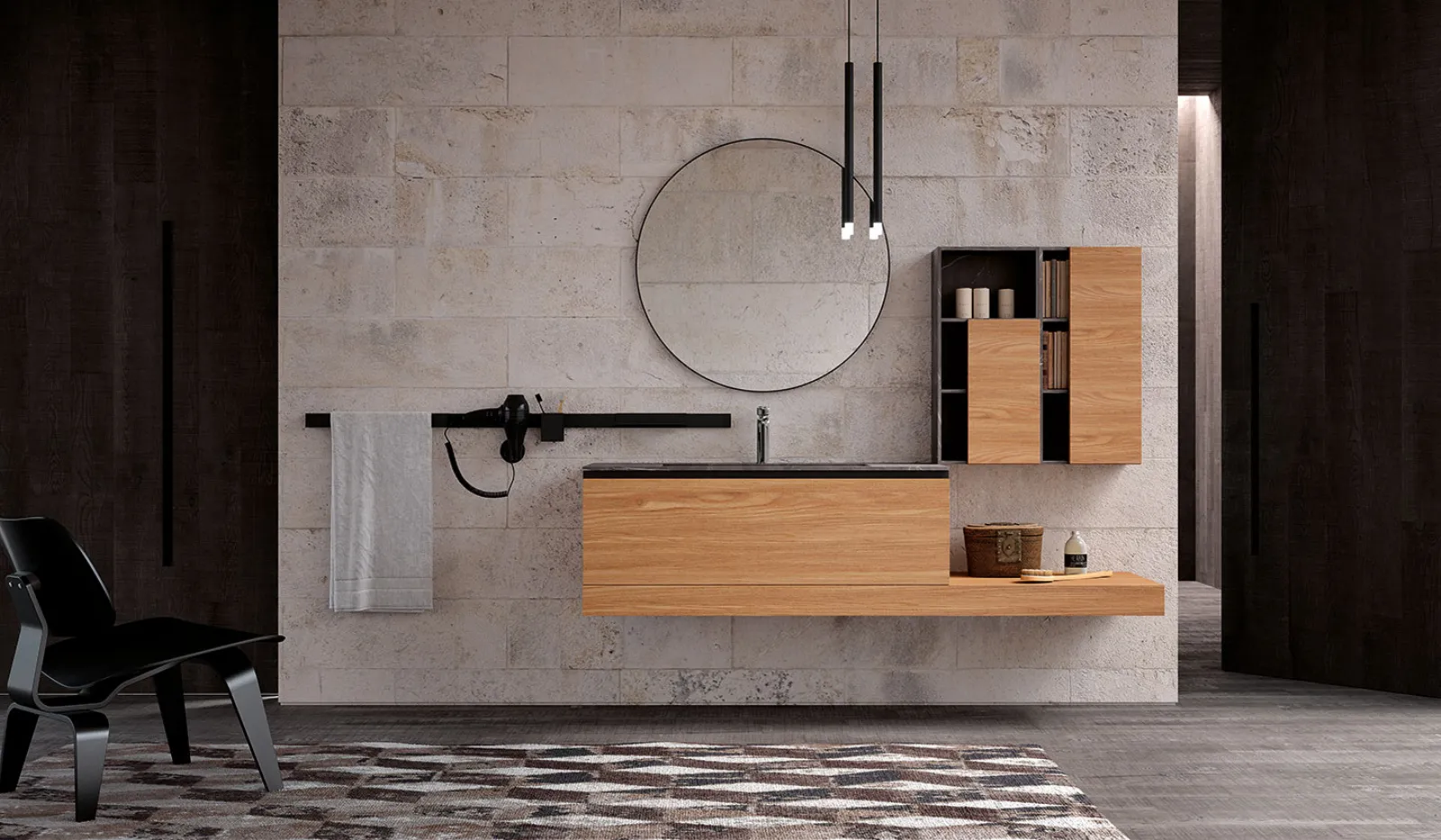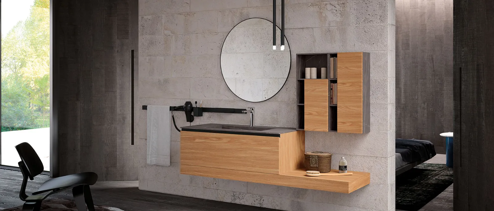 Impiallacciato Olmo con particolari Hpl Tobacco 440 e maniglia Titanio. Top Hpl Tobacco 440 con vasca integrata “HH”, specchio Gamma e lampade Tube in metallo nero
