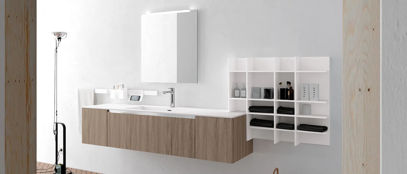 Skin Jerez, elementi a giorno Square laccati Bianco Opaco, maniglia alluminio satinato. Top Tecnoril con vasca integrata “H”, specchio Filo con lampada Clio Slim.