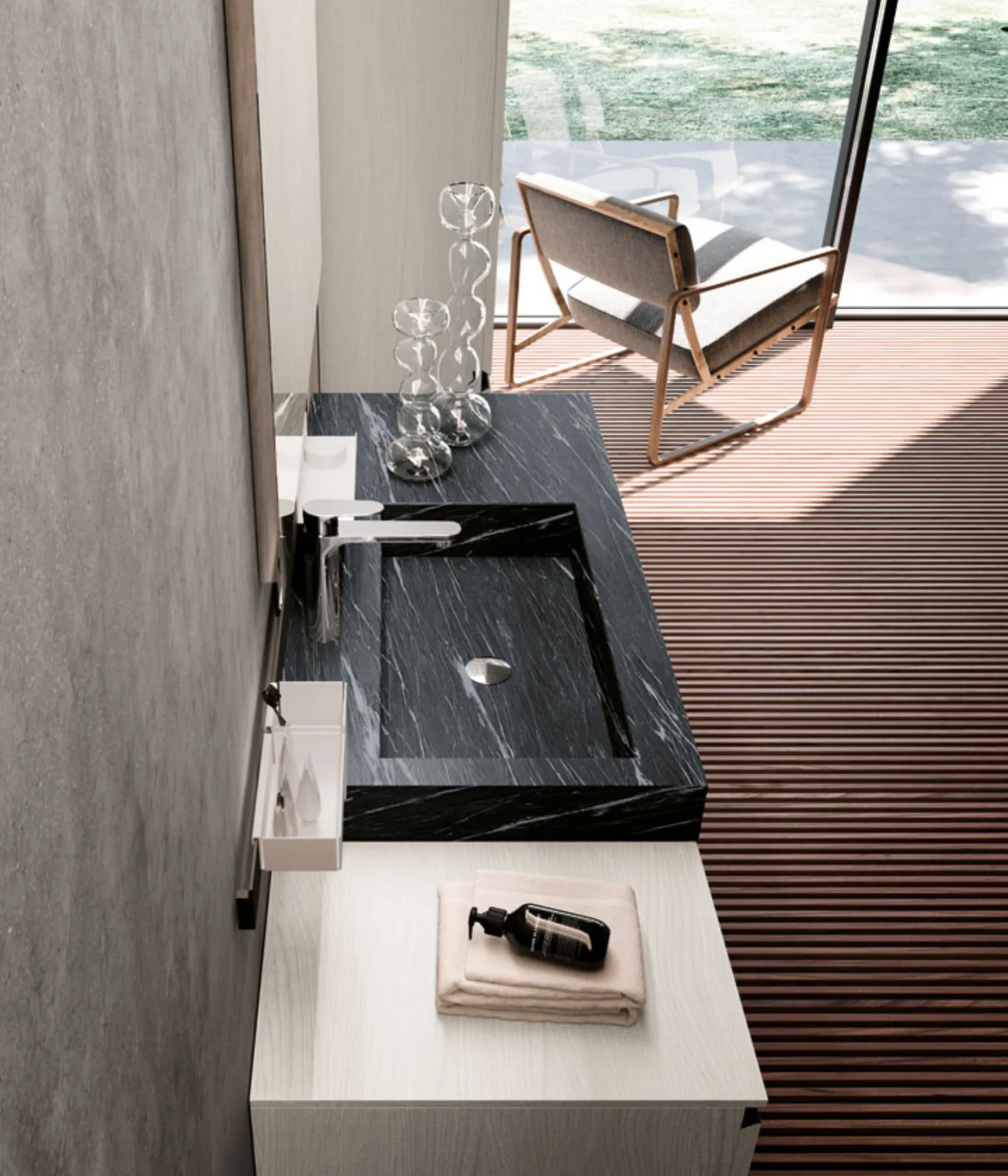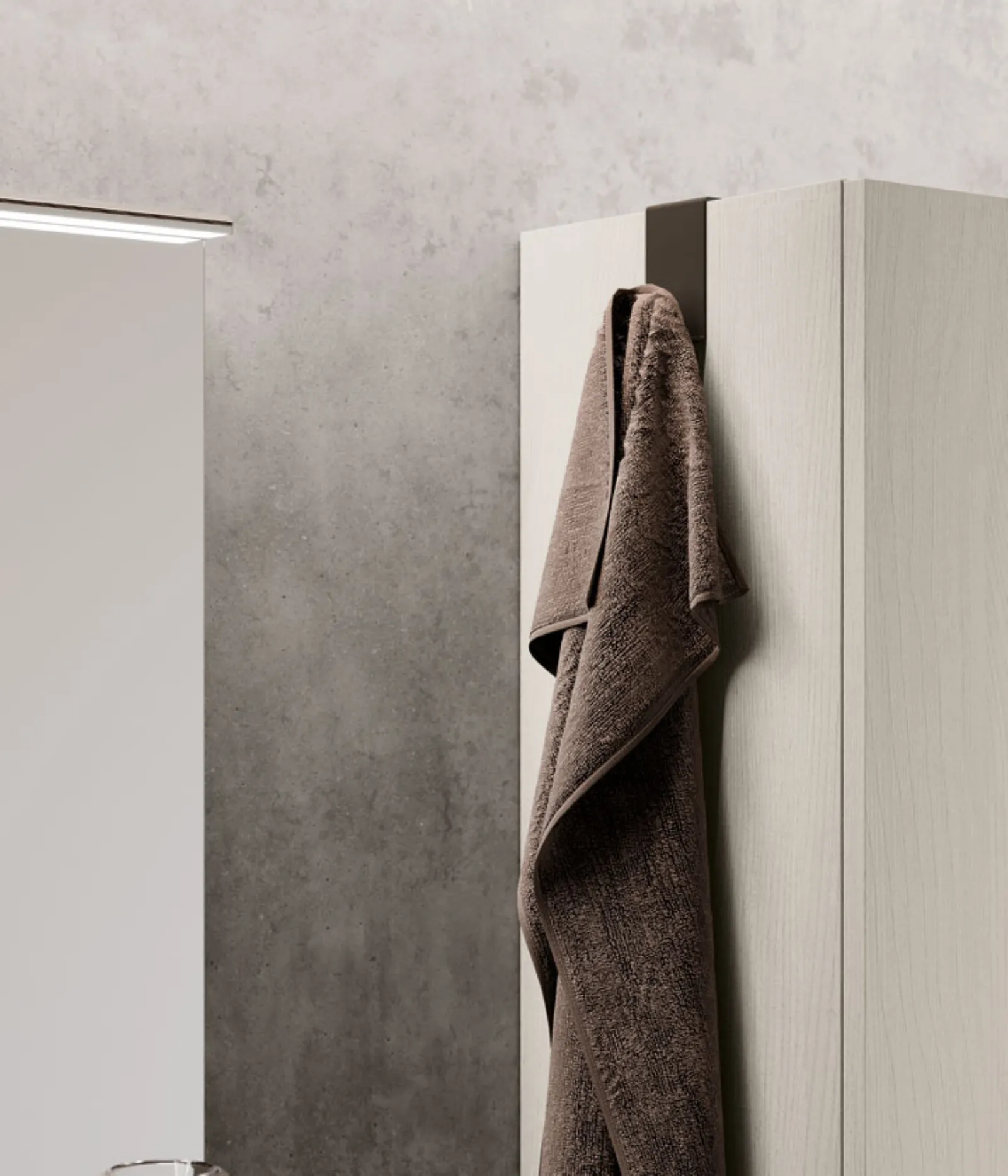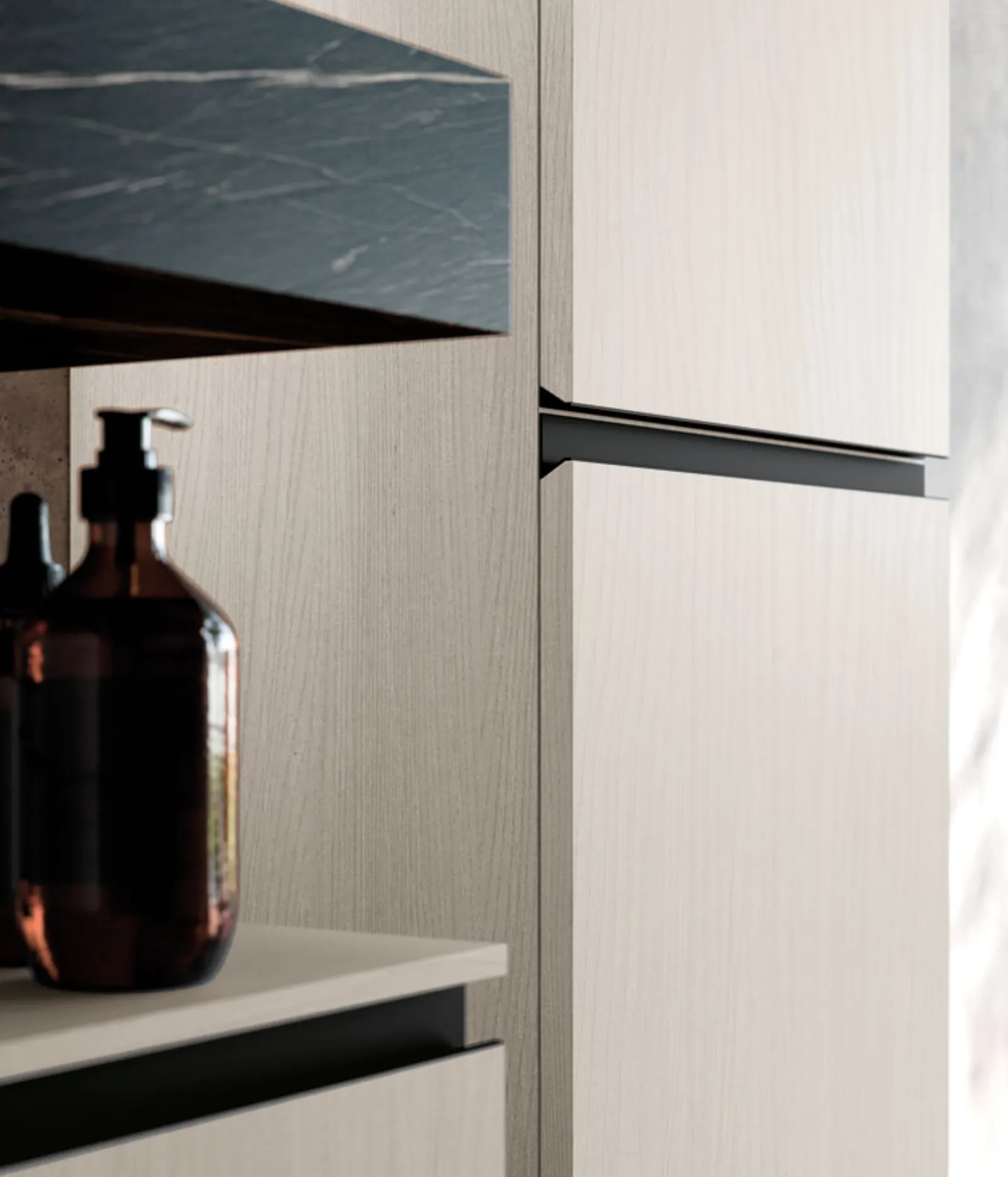 Skin Bianco con maniglia Titanio. Top hpl Calypso 435 sp. 10 cm con vasca integrata “HF”, specchio Filo con lampada Metro
