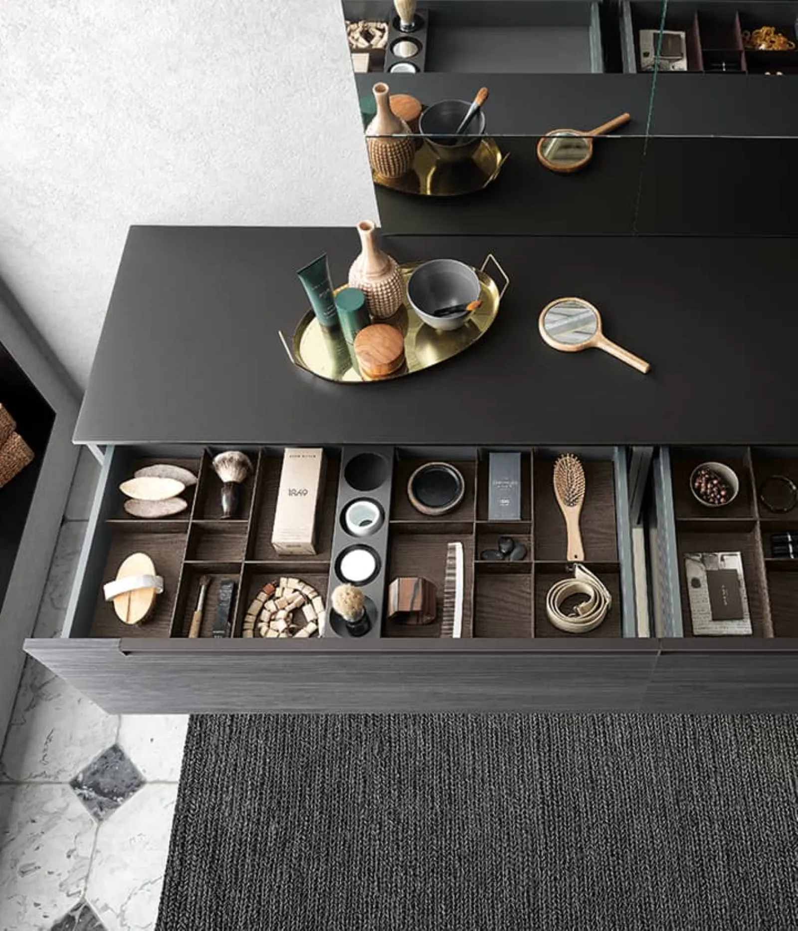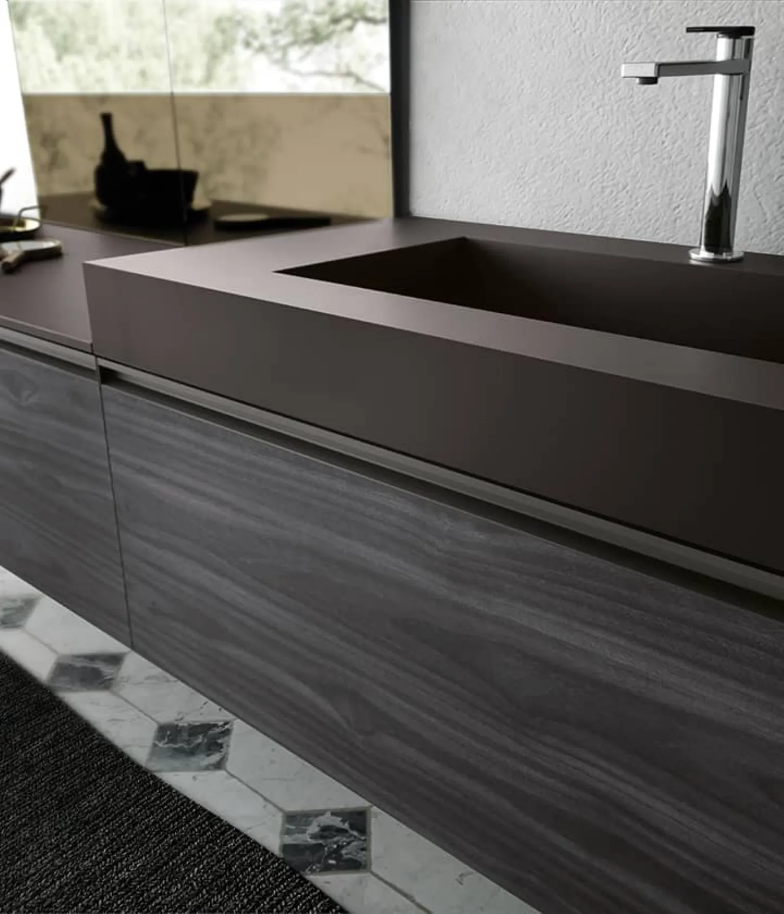 Bimelaminico Shibuya con maniglie titanio. Top in fenix nero 720 con vasca integrata HG. Specchi Line con lampada Compasso.