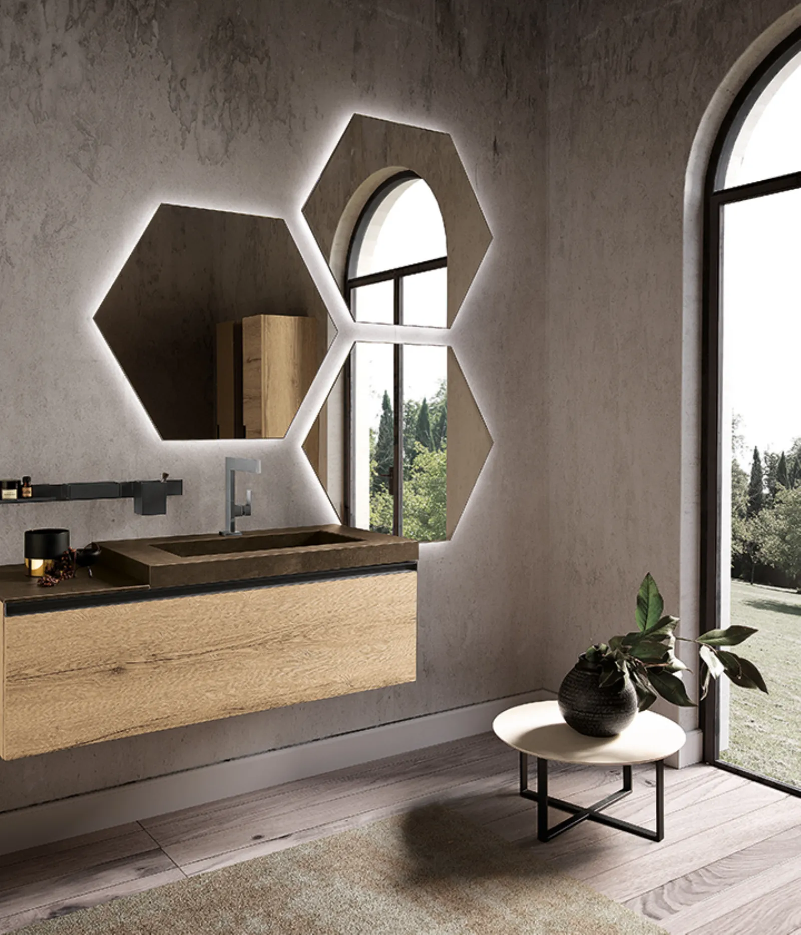 Bimelaminico rovere spaccato con maniglie titanio e top in gres ossido bruno con vasca integrata Gk. Specchi esagonali Ride con profilo nero e illuminazione perimetrale a led.